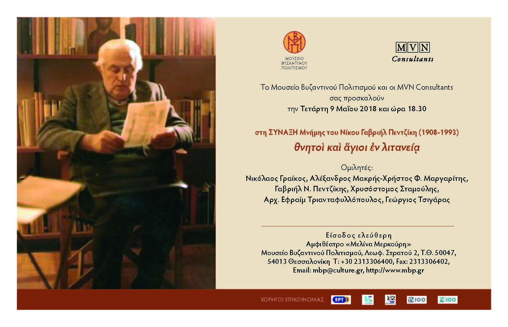 Το Μουσείο Βυζαντινού Πολιτισμού και οι MVN Consultants σας προσκαλούν την Τετάρτη 9 Μαΐου 2018 και ώρα 18.30 στη ΣΥΝΑΞΗ Μνήμης του Νίκου Γαβριήλ Πεντζίκη (1908-1993): θνητοὶ καὶ ἅγιοι ἐν λιτανείᾳ. Στην εκδήλωση θα μιλήσουν: Νικόλαος Γραίκος, Αλέξανδρος Μακρής-Χρήστος Φ. Μαργαρίτης, Γαβριήλ Ν. Πεντζίκης, Χρυσόστομος Σταμούλης, Αρχ. Εφραίμ Τριανταφυλλόπουλος, Γεώργιος Τσιγάρας. Την εκδήλωση προλογίζει η διευθύντρια του ΜΒΠ, δρ Αγαθονίκη Τσιλιπάκου.