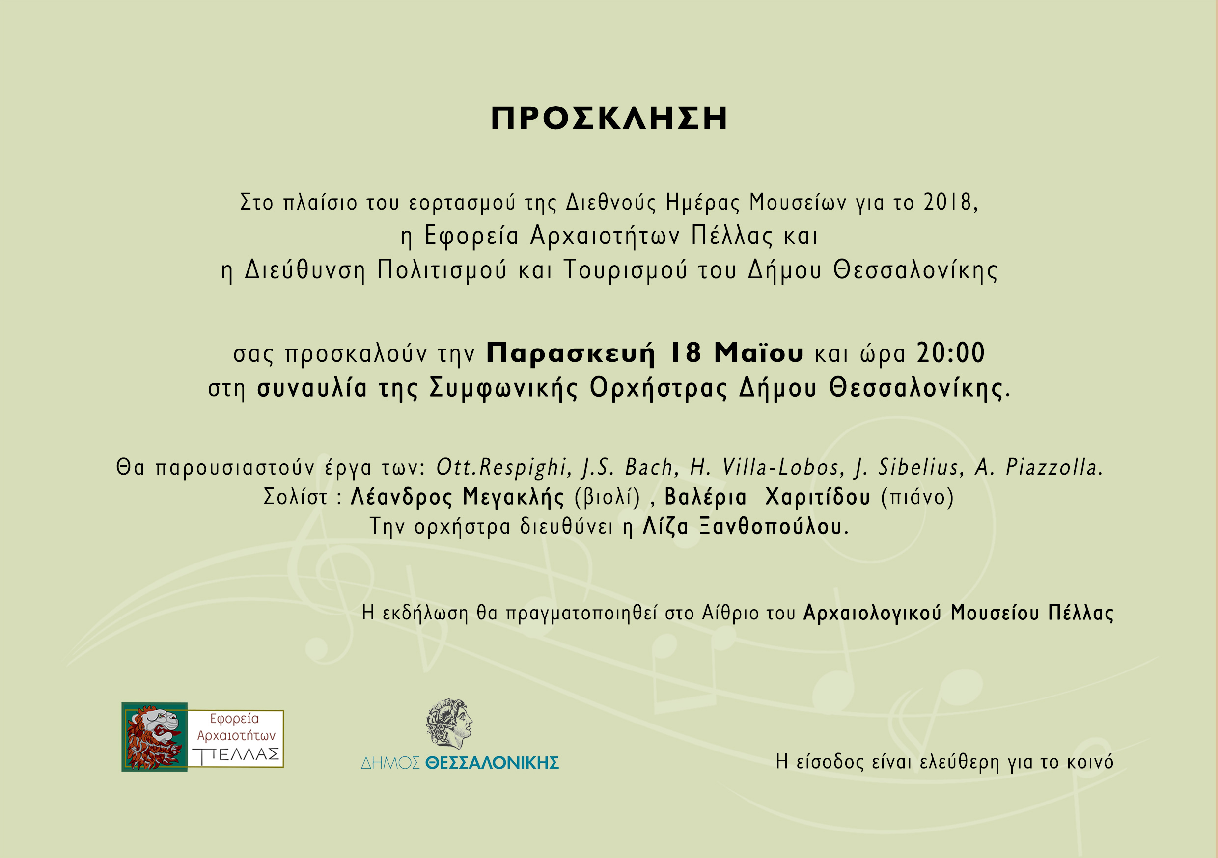 Στο πλαίσιο του εορτασμού της Διεθνούς Ημέρας Μουσείων για το 2018 με θέμα «Μουσεία και (δια)δίκτυα. Νέες προσεγγίσεις, νέο κοινό», η Εφορεία Αρχαιοτήτων Πέλλας και η Διεύθυνση Πολιτισμού και Τουρισμού του Δήμου Θεσσαλονίκης διοργανώνει: