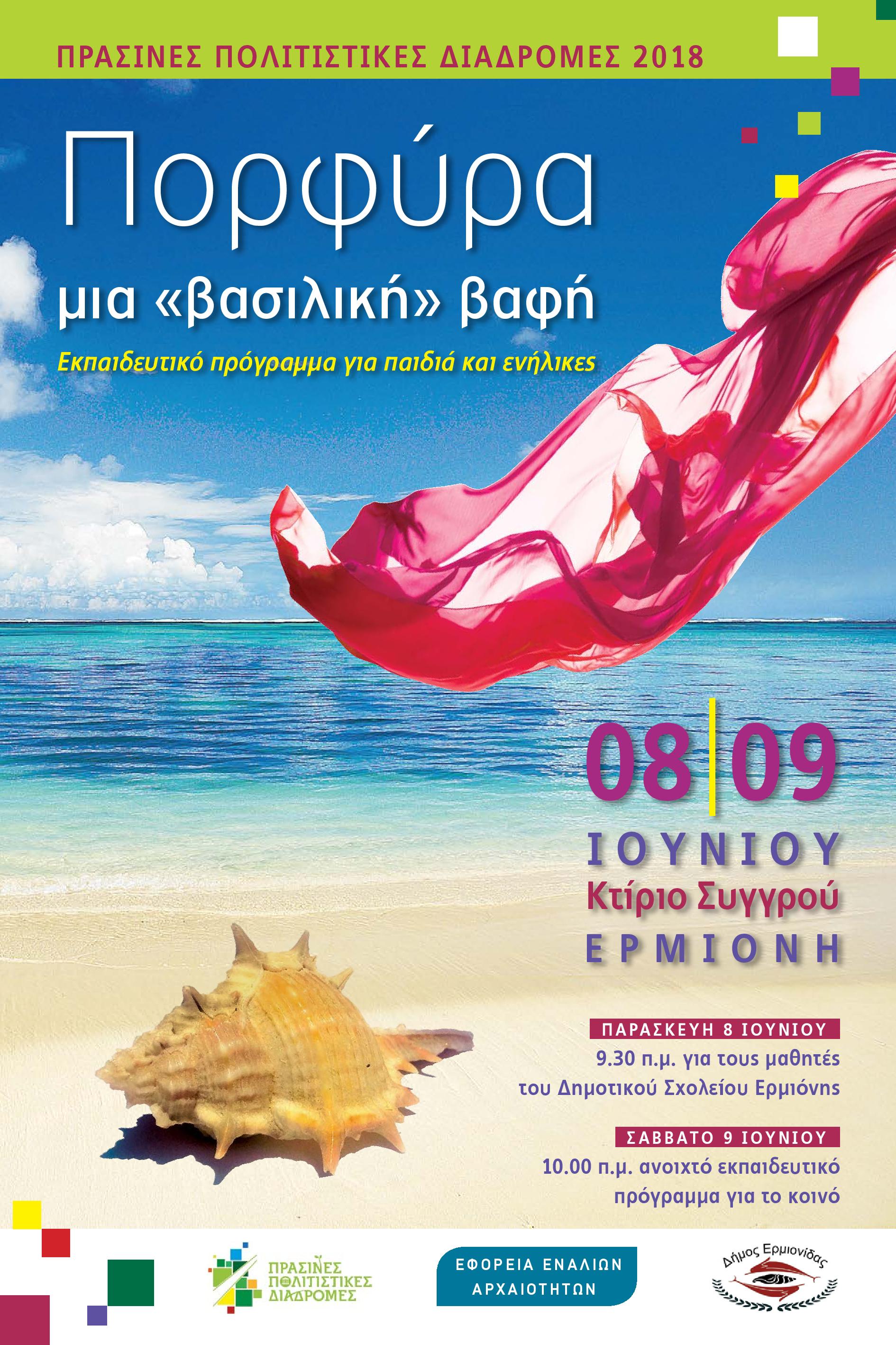 Στο πλαίσιο του εορτασμού των Πράσινων Πολιτιστικών Διαδρομών, η Εφορεία Εναλίων Αρχαιοτήτων και ο Δήμος Ερμιονίδας πραγματοποιούν από κοινού στις 8-9 Ιουνίου 2018 εκπαιδευτικό πρόγραμμα για παιδιά και ενήλικες με τίτλο