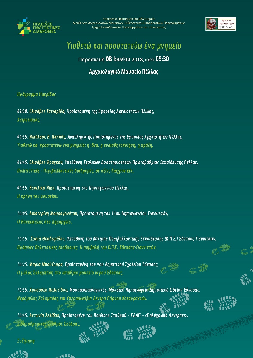Σχολικές μονάδες της Πρωτοβάθμιας Εκπαίδευσης, σε συνεργασία με το αντίστοιχο Γραφείο Σχολικών Δραστηριοτήτων και το Κέντρο Περιβαλλοντικής Εκπαίδευσης Έδεσσας-Γιαννιτσών, «υιοθετούν» ένα μνημείο (αρχαίο, βυζαντινό, οθωμανικό, νεότερο) της περιοχής τους και προτείνουν τρόπους για την προστασία (καθαρισμό από σκουπίδια, αφισοκολλήσεις και graffiti, από βανδαλισμούς, από κλοπές διάφορων διακοσμητικών και αρχιτεκτονικών στοιχείων, κλ.π.) και την ανάδειξή του.