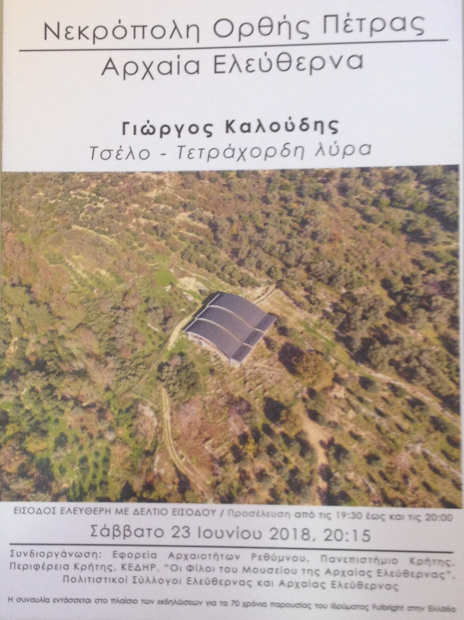 Συναυλία του Γιώργου Καλούδη με τσέλο και τετράχορδη λύρα στον αρχαιολογικό χώρο της Νεκρόπολης της Ορθής Πέτρας στην Αρχαία Ελεύθερνα.