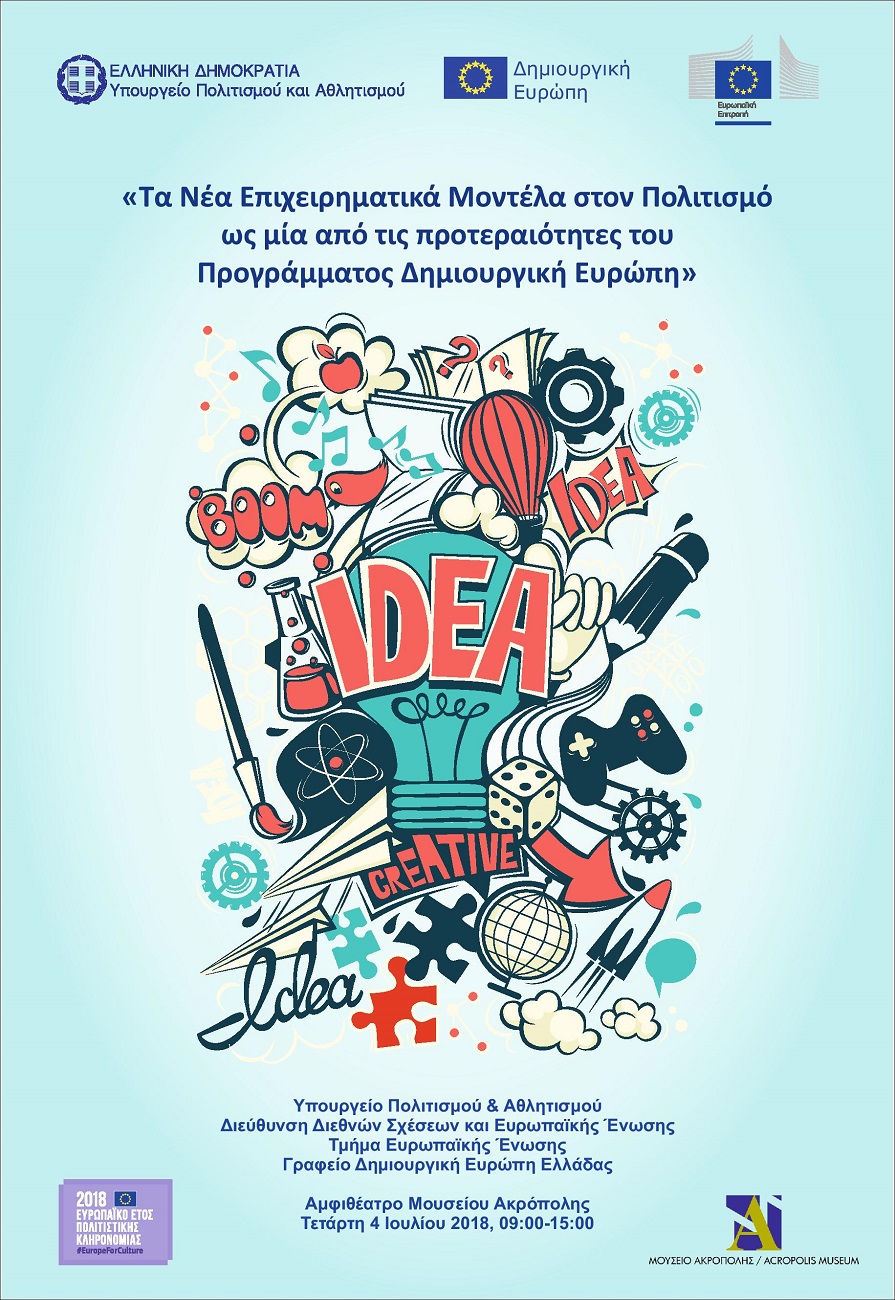 Ημερίδα με θέμα «Τα Νέα Επιχειρηματικά Μοντέλα στον Πολιτισμό ως μία από τις προτεραιότητες του Προγράμματος Δημιουργική Ευρώπη», που θα πραγματοποιηθεί στις 4 Ιουλίου 2018, στο αμφιθέατρο του Μουσείου Ακρόπολης.