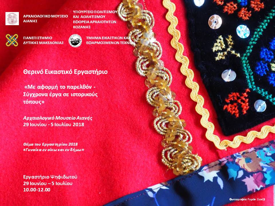 Η Εφορεία Αρχαιοτήτων Κοζάνης σε συνεργασία με το Τμήμα Εικαστικών και Εφαρμοσμένων Τεχνών του Πανεπιστημίου Δυτικής Μακεδονίας και την υποστήριξη της Περιφέρειας Δυτικής Μακεδονίας οργανώνουν στο Αρχαιολογικό Μουσείο Αιανής, το Θερινό Εικαστικό Εργαστήριο «Με αφορμή το παρελθόν – Σύγχρονα έργα σε ιστορικούς τόπους».