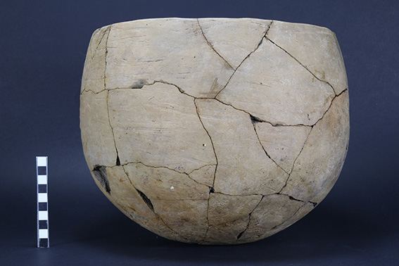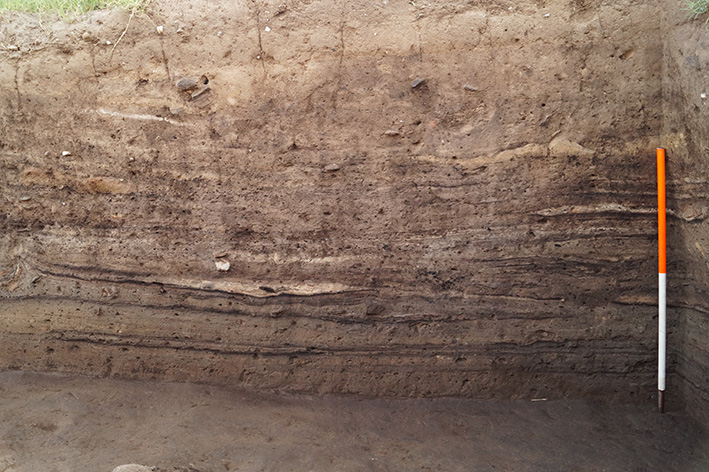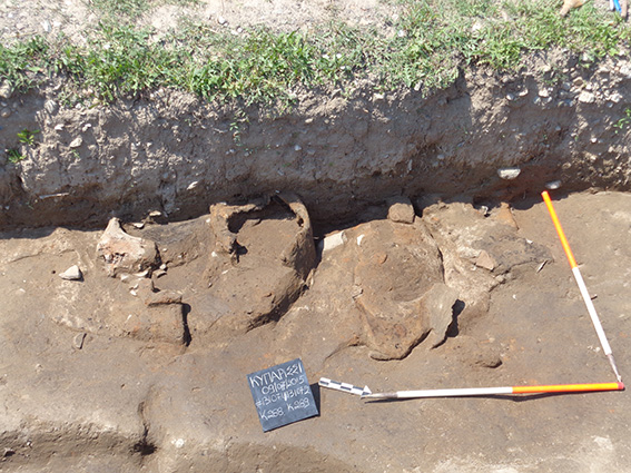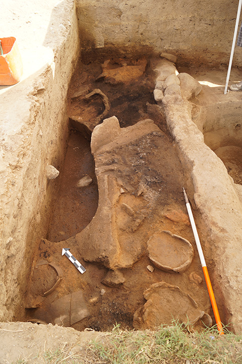 Οι ανοικτοί χώροι συνεχίζονται προς τα νότια, όπου ερευνήθηκαν μεγάλοι αποθέτες και θερμικές κατασκευές σε υπαίθριους χώρους. Μεγάλη έκταση καταλαμβάνει ένας λάκκος που σκάφτηκε εν μέρει αφού οι επιχώσεις του συνεχίζονται εκτός του έργου. Η επίχωσή του αποτελείται από επάλληλα στρώματα πεσμένων οικοδομικών υλικών που εναλλάσσονται με λεπτές στρώσεις καύσης και στάχτης (Εικ. 6). Έχει κοινά στοιχεία με τον μεγάλο αποθέτη που εξετάσαμε παραπάνω και προφανώς αποδέχεται τα απορρίμματα κάποιων φάσεων του οικισμού. Συνδέονται τουλάχιστον σε κάποιες φάσεις της μακρόχρονης χρήσης τους με γειτονικές περιοχές θερμικών κατασκευών (Εικ. 7). Στο υπόλοιπο τμήμα του οικισμού που ερευνήθηκε φέτος διαπιστώθηκε η συνεχής εναλλαγή ανοικτών και κλειστών χώρων με πολύ αποσπασματική διατήρηση.