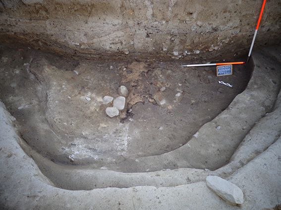 Νότια του τοίχου που ορίζει το πέρας του οικήματος, σε χώρο που ερμηνεύεται ως ανοικτός, διερευνήθηκε τμήμα ενός μεγάλου λάκκου, τα όρια του οποίου ξεπερνούν τα αυτά της ανασκαφικής τομής. Στην ουσία πρόκειται για μια ευρεία κοιλότητα, όπου εναποτίθενται υλικά για μεγάλο χρονικό διάστημα. Οι αποθέσεις χρονολογούνται μετά την καταστροφή του παρακείμενου οικήματος και αποτελούνται από πολύ λεπτά στρώματα τα οποία παρουσιάζουν κατωφερική κλίση προς νότο. Ανάμεσα εντοπίζονται διάφορες στρώσεις που μπορούν να ερμηνευτούν ως δάπεδα από κιτρινωπό πηλό, ενώ υπάρχουν και άλλες στρώσεις καστανοκόκκινου πηλού ανάμεσα σε γκρίζα και μαύρα στρώματα με υψηλή περιεκτικότητα σε άνθρακες και οργανικά υλικά (Εικ. 5). Περιείχαν πολλά ευρήματα, κεραμική, οστά, εργαλεία και αποστρογγυλεμένα όστρακα. Τα ευρήματα και η στρωματογραφία δείχνουν ότι έχουμε έναν χώρο που χρησιμοποιείται συστηματικά για απόρριψη από τους κατοίκους του οικισμού, ο οποίος κατά τη διάρκεια της μακρόχρονης χρήσης του συχνά φαίνεται να ισοπεδώνεται ή να σφραγίζεται με δάπεδα και ενδεχομένως να στεγάζεται πρόχειρα.