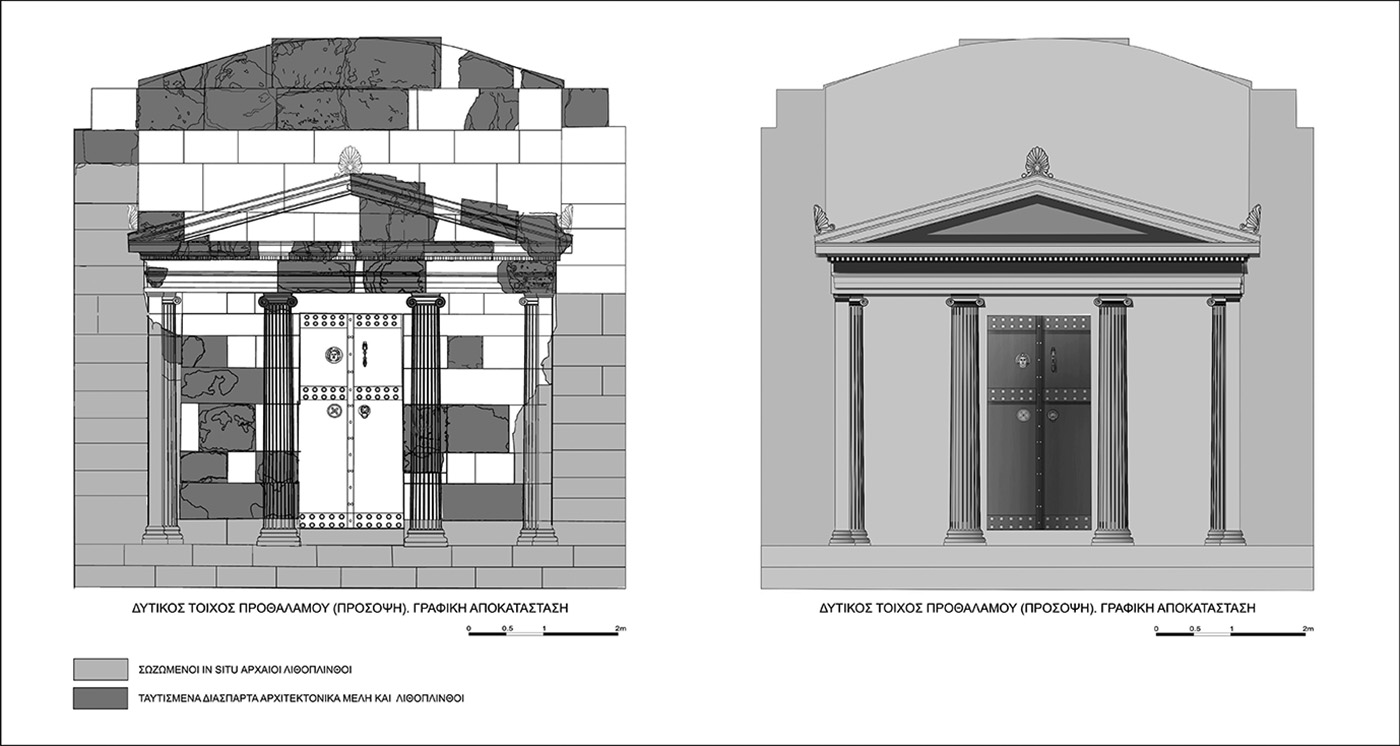 Την ίδια χρονική περίοδο ολοκληρώθηκε και η αποκατάσταση του κατεστραμμένου τυμπάνου του δυτικού τοίχου του προθαλάμου (όψη νεκρικού θαλάμου), στη σύγχρονη παραμορφωμένη μορφή του, με την επανένταξη του συνανήκοντος διάσπαρτου δομικού υλικού (λιθόπλινθοι), το οποίο καταγράφηκε και ταυτίστηκε κατά την εκπόνηση της μελέτης αποκατάστασης, και τη συμπλήρωση των καταστραμμένων λιθοπλίνθων με νέες κατασκευασμένες από τεχνητό λίθο. Παράλληλα έγινε και η δομική ενίσχυση των ανακατασκευασμένων νέων λιθοπλίνθων του τυμπάνου με ράβδους ανοξείδωτου χάλυβα (Εικ. 4).