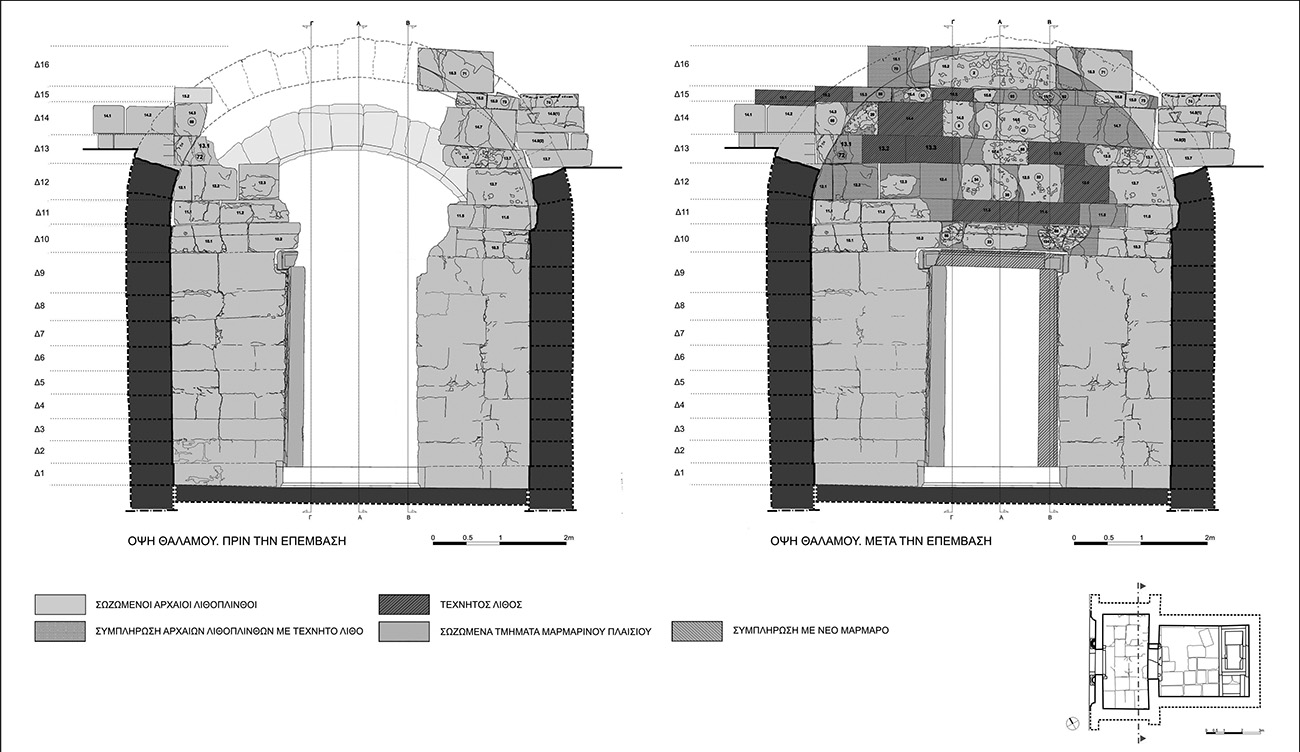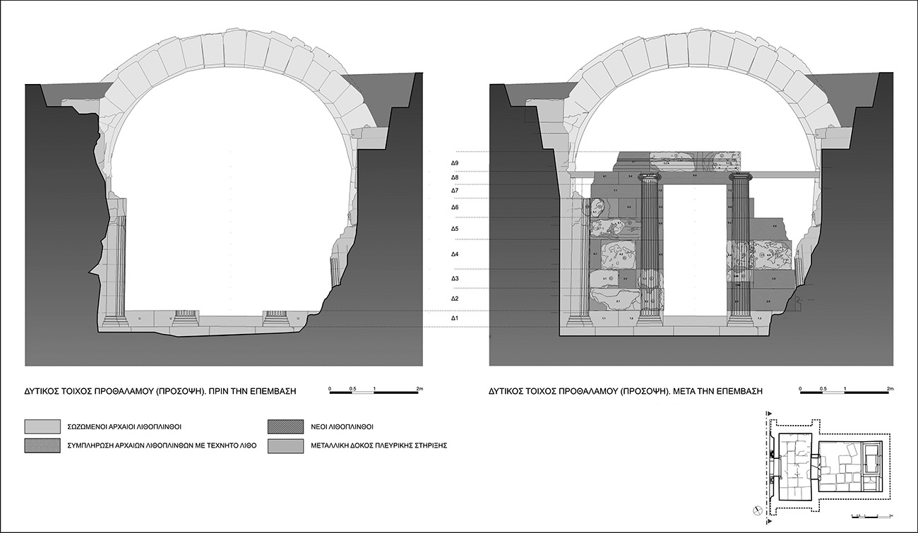 Η επέμβαση είχε ως στόχο να καταστήσει αναγνώσιμη την εξωτερική αρχιτεκτονική διαμόρφωση της πρόσοψης με την επανένταξη των ταυτισμένων διάσπαρτων αρχιτεκτονικών μελών και λιθοπλίνθων και τη συμπλήρωση των καταστραμμένων με νέες κατασκευασμένες από πωρόλιθο (Εικ. 2). Η έκταση της επέμβασης ήταν συνάρτηση της παραμένουσας, στα άκρα του τοίχου, παραμόρφωσης, για αυτό και περιορίστηκε στην αποκατάσταση του κεντρικού τμήματος του τοίχου, το οποίο δεν είχε απόκλιση από την κατακόρυφο. Αποκαταστάθηκαν οι δύο ημικίονες, εκατέρωθεν της εισόδου, το βόρειο τμήμα του τοίχου, και το κεντρικό τμήμα του επιστυλίου. Οι δόμοι του νότιου τμήματος του τοίχου εξαιτίας της μεγάλης παραμόρφωσης που είχε υποστεί ο τεταρτοκιόνας αποκαταστάθηκαν μερικώς. Για να αποτραπεί ο κίνδυνος ενδεχόμενης ανατροπής του τοίχου λόγω σεισμού, υλοποιήθηκε η πλευρική αντιστήριξή του με μεταλλική δοκό, η οποία ενσωματώθηκε στις νέες λιθοπλίνθους του όγδοου δόμου. Η στήριξή της έγινε εντός των εγκοπών που υπάρχουν στους πλευρικούς τοίχους του προθαλάμου, με την χρήση ράβδων αγκύρωσης, που πακτώθηκαν στις αποκαταστημένες λιθόπλινθους της στέψης των πλευρικών τοίχων του προθαλάμου (Εικ. 3).