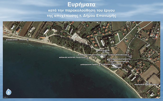 Συνεχίστηκε και κατά τη διάρκεια του 2015, η παρακολούθηση των εργασιών εκσκαφής για τη β΄ φάση του έργου «Αποχέτευση Δήμου Επανωμής-2ος ειδικός προϋπολογισμός», όπου σ΄ όλη την πορεία-διαδρομή των αγωγών εντοπίσθηκαν αρχαιότητες (Εικ. 1). Εντοπίσθηκε ένα εργαστηριακό συγκρότημα ρωμαϊκών χρόνων, και έτσι διαπιστώνουμε την εξέλιξη του αρχαίου πολίσματος κατά την ρωμαιοκρατία και την διατήρησή του στην πρώιμη χριστιανική εποχή.