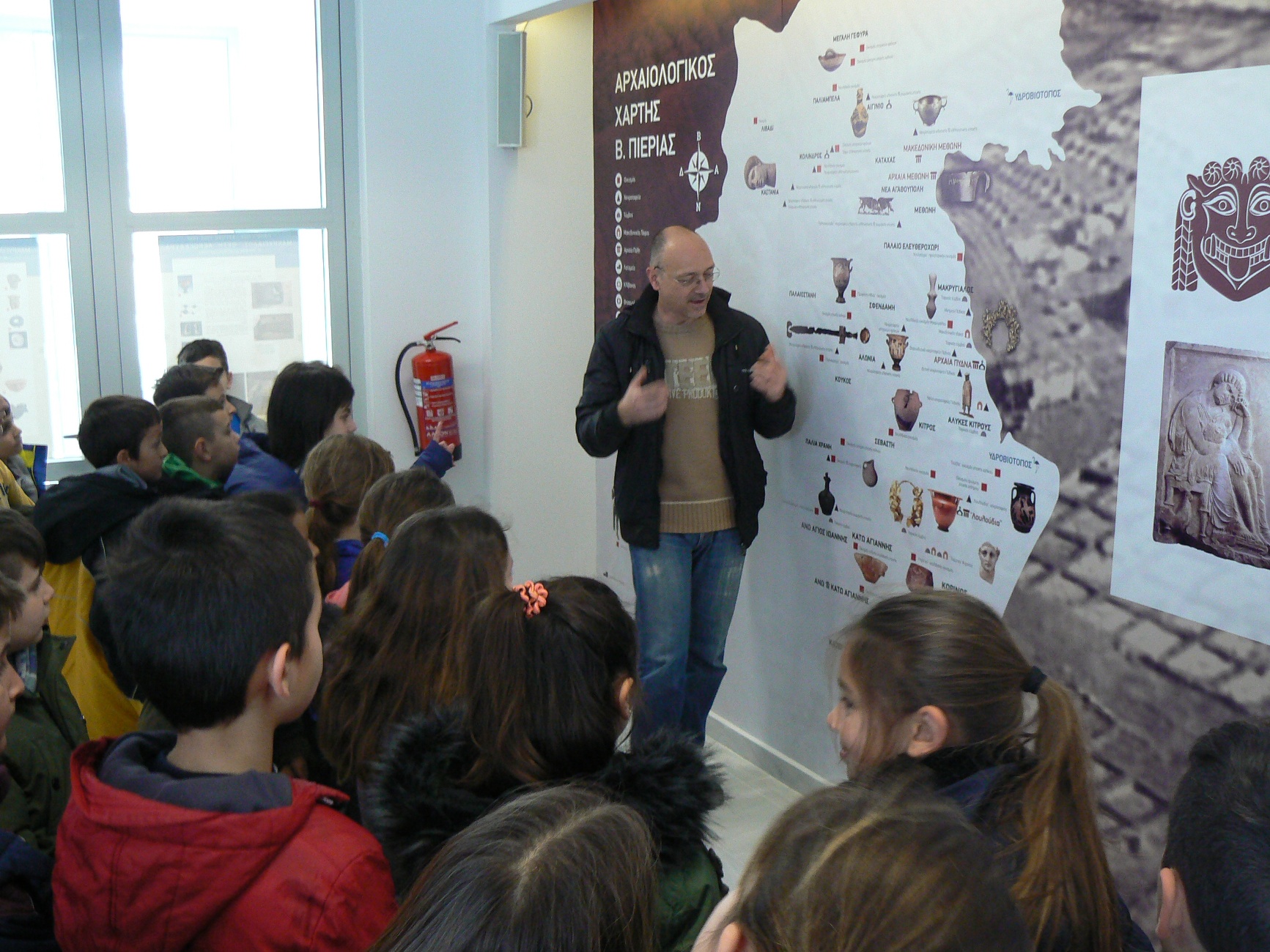 Α) Αρχικά οι μικροί επισκέπτες ξεναγούνται στον πρώτο όροφο της Ε.Μ.Α.Μ. Γίνεται εισαγωγή στην ιστορία και αρχαιολογία της Βόρειας Πιερίας μπροστά σε γραφιστικά με ανάλογο πληροφοριακό υλικό και φωτογραφίες σημαντικών ευρημάτων από την περιοχή. Στη συνέχεια περιηγούνται μπροστά σε προθήκη με αγγεία και ευρήματα κλασικής – ελληνιστικής εποχής από τα νεκροταφεία και τους οικισμούς της Β.Πιερίας, καθώς και σε δεύτερη προθήκη με αγγεία της Εποχής Σιδήρου. Τέλος, μαθαίνουν για το εμπόριο και τις επαφές του τόπου με άλλες περιοχές με αφορμή τους πολυάριθμους αμφορείς από ανασκαφές που εκτίθενται σε ειδική κατασκευή.