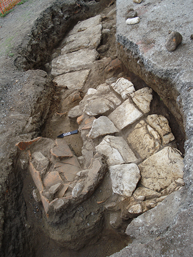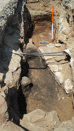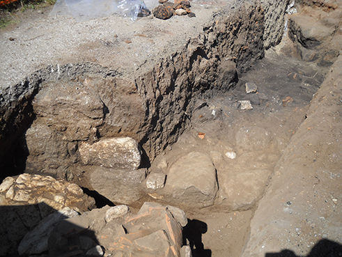 Αυτό που είχε διαφανεί από το προηγούμενο ανασκαφικό έτος, η ύπαρξη στρώματος καταστροφής των πρώιμων ελληνιστικών χρόνων, επιβεβαιώθηκε κατά τη διάνοιξη των υπολοίπων μέτρων του αγωγού. Οι τάφοι των πρώιμων βυζαντινών χρόνων διαταράσσουν σε μήκος 13 περίπου μέτρων, στην κορυφή του υψώματος που καταλαμβάνει το εκκλησάκι, ένα στρώμα καταστροφής κτιρίου από το οποίο αποκαλύφθηκαν τμηματικά θεμελιώσεις τοίχων και κατασκευών. Αποκαλύφθηκε το ανατολικό πέρας του κτιρίου (εικ. 2) και τμήματα κατασκευών και εσωτερικών τοίχων (εικ. 3-4) δυτικότερα που δεν προσφέρουν όμως σαφή εικόνα για την κάτοψη του κτιρίου. Τα οικοδομικά κατάλοιπα της φάσης αυτής είναι πολύ αποσπασματικά και η συνολική εικόνα ελλιπής κυρίως λόγω της διαταραχής που έχει προκληθεί από την κατασκευή των μεταγενέστερων τάφων και του σύγχρονου δικτύου ύδρευσης. Είναι όμως σαφές ότι όλοι οι τοίχοι και οι κατασκευές καλύπτονταν από ένα ενιαίο στρώμα καύσης και καταστροφής με την κεραμική να το χρονολογεί στο τέλος του 4ου με αρχές του 3ου αιώνα π.Χ. Η τυπολογία της υποδεικνύει τυπική οικοσκευή με αγγεία καθημερινής χρήσης, σερβιρίσματος και αποθήκευσης. Προβληματική είναι η μεγάλη ποσότητα υπολειμμάτων από επεξεργασία μεταλλευμάτων (σιδηρόμαζες, υαλόμαζες) που υποδεικνύουν βιοτεχνική δραστηριότητα, αν όχι στο ίδιο το κτίριο, σίγουρα σε άμεση γειτνίαση.