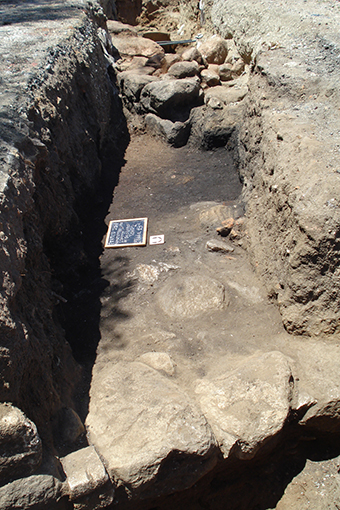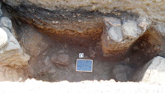 Στην περιοχή που καταλάμβανε το ανατολικό τμήμα του κτιρίου και ανατολικότερα αυτού, διαπιστώθηκε η ύπαρξη μίας προγενέστερης φάσης κατοίκησης. Το δάπεδο χρήσης είναι ο φυσικός βράχος όπου είχαν ανοιχτεί ορύγματα, το δάπεδο των οποίων καλύπτεται από τεφρό στρώμα (εικ. 5). Η μορφή των ορυγμάτων δεν ήταν δυνατό να διαπιστωθεί λόγω της στενότητας του χώρου και της επικάλυψής τους από τα αρχιτεκτονικά κατάλοιπα της φάσης των ελληνιστικών χρόνων.