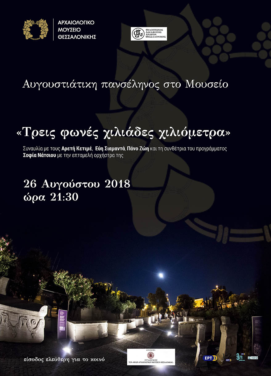 Στο πλαίσιο των εκδηλώσεων για την Αυγουστιάτικη Πανσέληνο το Αρχαιολογικό Μουσείο Θεσσαλονίκης, σε συνεργασία με τη Φιλόοπτωχο Αδελφότητα Ανδρών Θεσσαλονίκης, διοργανώνουν συναυλία με τους Αρετή Κετιμέ, Εύη Σιαμαντά, Πάνο Ζώη και τη συνθέτρια του προγράμματος Σοφία Νάτσιου με την επταμελή ορχήστρα της.