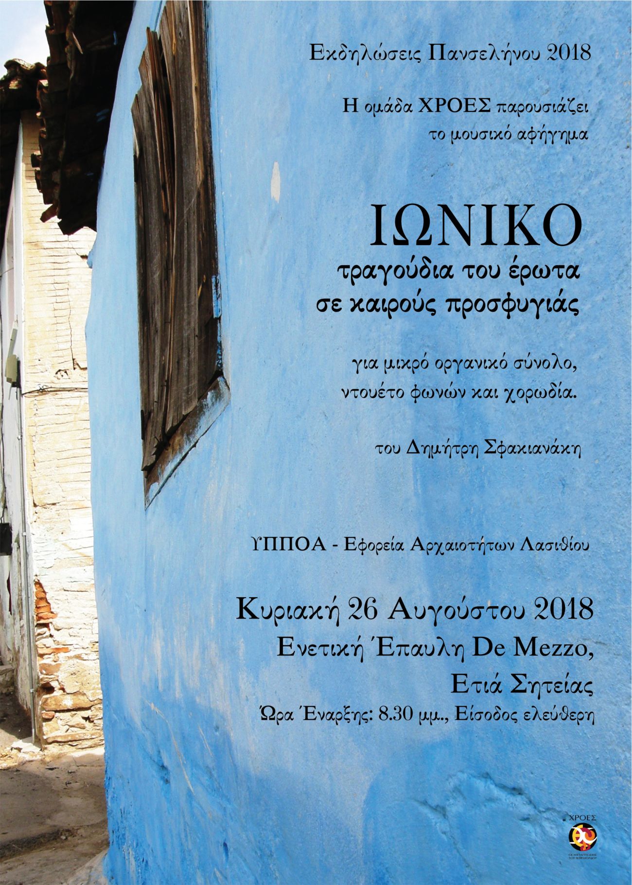 Μουσική εκδήλωση στον αύλειο χώρο της Ενετικής έπαυλης De Mezzo στην Ετιά Σητείας με το έργο "ΙΩΝΙΚΟ- Τραγούδια του έρωτα σε καιρούς προσφυγιάς" του συνθέτη Δημήτρη Σφακιανάκη, και το Μουσικό Σύνολο "ΧΡΟΕΣ" (Φωνητικό σύνολο και ορχήστρα). Ώρες εκδήλωσης: 20:30 έως 23:30.
