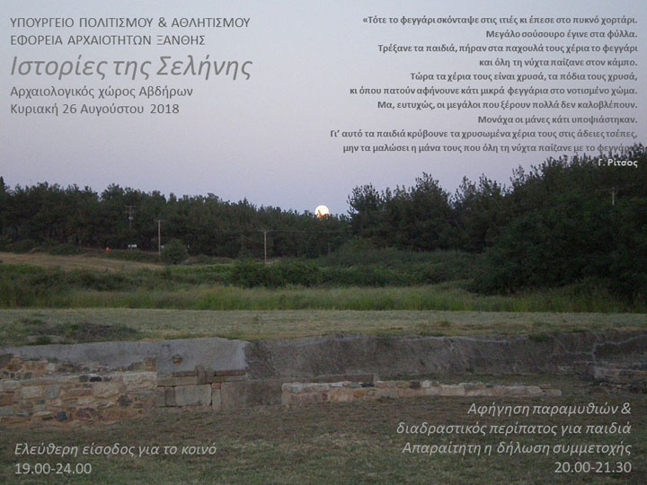 Η Εφορεία Αρχαιοτήτων Ξάνθης, συμμετέχοντας στον πανελλήνιο εορτασμό της Πανσελήνου, σας προσκαλεί την Κυριακή, 26 Αυγούστου στον αρχαιολογικό χώρο Αβδήρων.