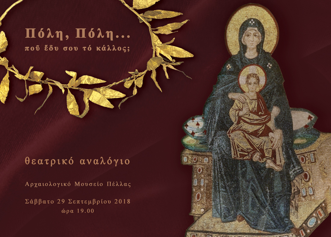 Η Εφορεία Αρχαιοτήτων Πέλλας, στο πλαίσιο του εορτασμού των Ευρωπαϊκών Ημερών Πολιτιστικής Κληρονομιάς 2018 με τον γενικό τίτλο ΠΟΛ(ε)ΙΣ, παρουσιάζει στο Αρχαιολογικό Μουσείο Πέλλας το θεατρικό αναλόγιο με τίτλο «Πόλη, Πόλη… ποῦ ἔδυ σου τό κάλλος;».