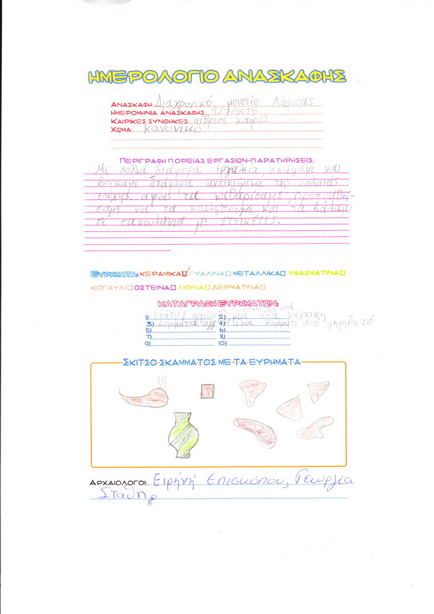 Τα παιδιά έχουν την ευκαιρία να παρακολουθήσουν αλλά και να συμμετάσχουν ενεργά σε μία μικρή ανασκαφή μέσα από ένα διαδραστικό παιχνίδι, το οποίο περιλαμβάνει όλα τα στάδια της ανασκαφικής διαδικασίας, συλλογής, ταξινόμησης, σχεδιασμού και πρώτης συντήρησης των ευρημάτων. Σ' αυτήν την περιήγηση – εργαστήρι ανασκαφής, που οργανώνεται στον περιβάλλοντα χώρο του Διαχρονικού Μουσείου, τα παιδιά γνωρίζουν ένα σημαντικό κομμάτι της ιστορίας της πόλης της Λάρισας και διδάσκονται έννοιες, όπως είναι η διατήρηση της πολιτιστικής κληρονομιάς και ο σεβασμός προς τα αρχαία και νεότερα μνημεία. Επιπλέον, μαθαίνουν ποιο είναι το αντικείμενο με το οποίο ασχολείται ο αρχαιολόγος, οι εργατοτεχνίτες της ανασκαφής, ο σχεδιαστής και ο συντηρητής. Παράλληλα, κρατούν ημερολόγιο ανασκαφής και σχεδιάζουν τα ευρήματα, ενώ προσπαθούν να φανταστούν και να πλάσουν ιστορίες σχετικά με την προέλευσή τους, σε μια μοναδική και αξέχαστη εμπειρία.