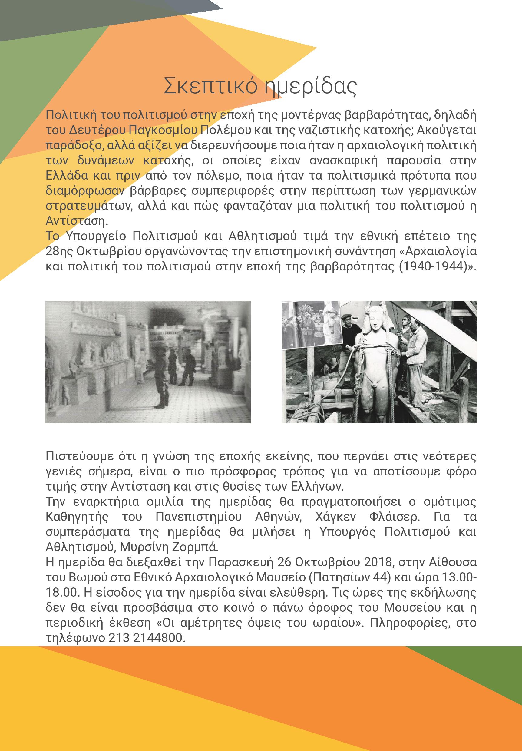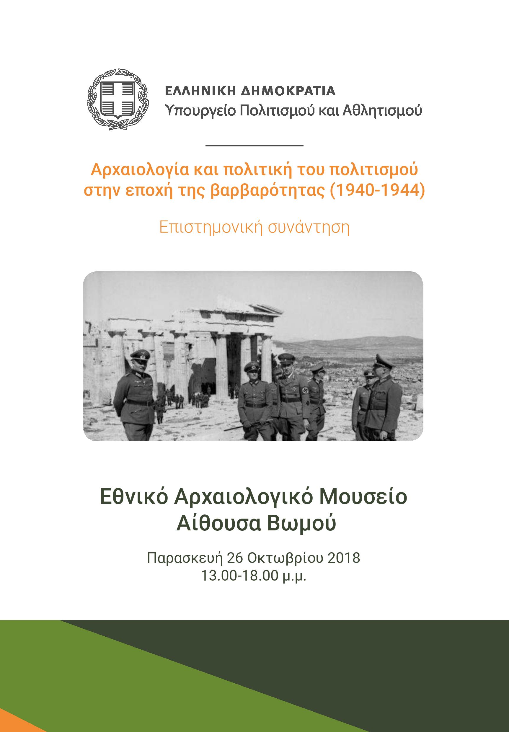 Με το σκεπτικό ότι η γνώση της περιόδου της ναζιστικής κατοχής είναι ο προσφορότερος τρόπος για να αποτίσουμε φόρο τιμής στην Αντίσταση και τις θυσίες των Ελλήνων, πραγματοποείται η επιστημονική συνάντηση που διοργανώνει το Υπουργείο Πολιτισμού και Αθλητισμού, με θέμα «Αρχαιολογία και Πολιτική του Πολιτισμού στην Εποχή της Βαρβαρότητας (1940-1944).