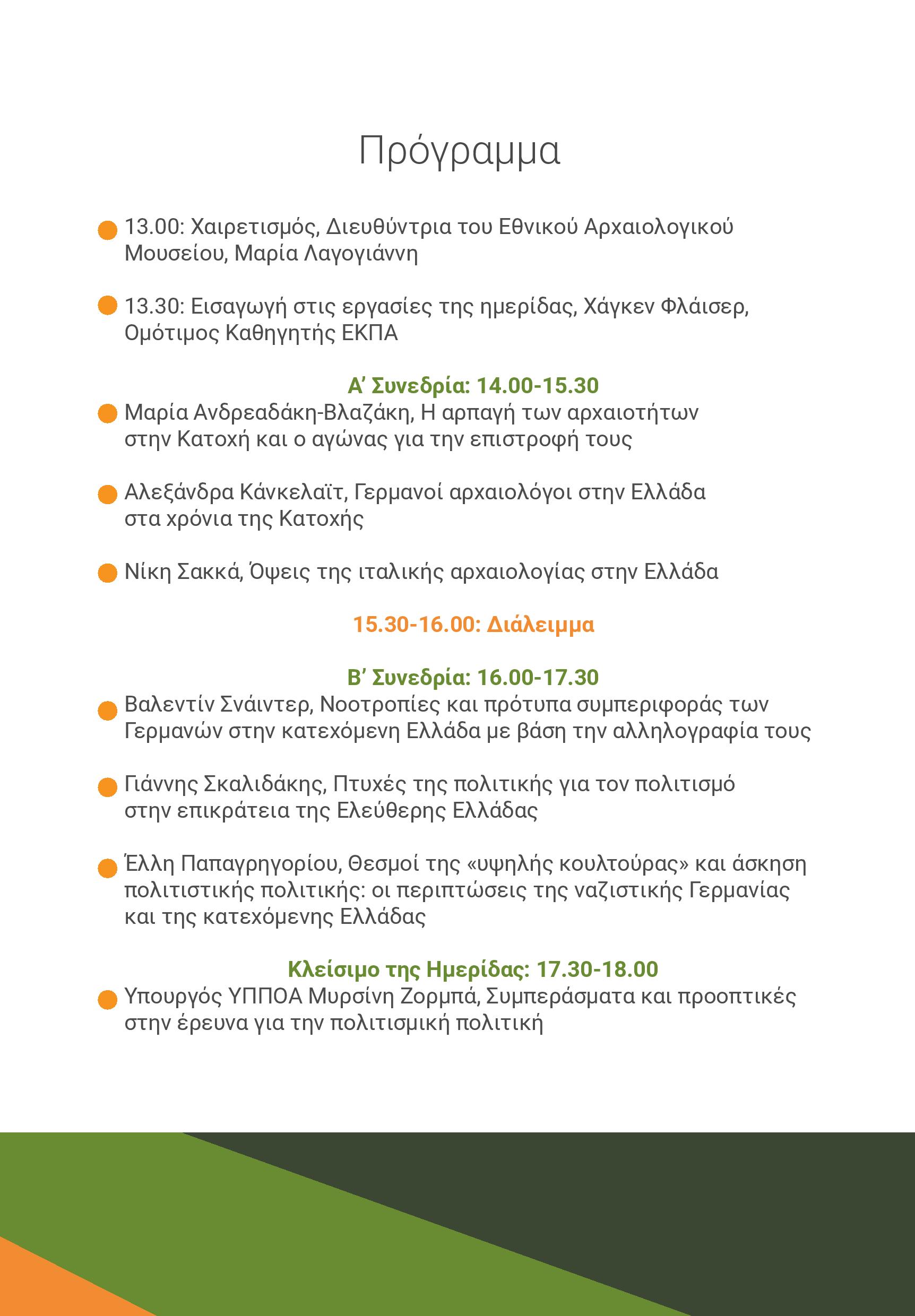 Οι ομιλητές θα διερευνήσουν την αρχαιολογική πολιτική των δυνάμεων κατοχής, τα πολιτισμικά πρότυπα που διαμόρφωσαν τις βάρβαρες συμπεριφορές των γερμανικών στρατευμάτων, αλλά και την αντίληψη της ελληνικής Αντίστασης για την πολιτική του πολιτισμού.
