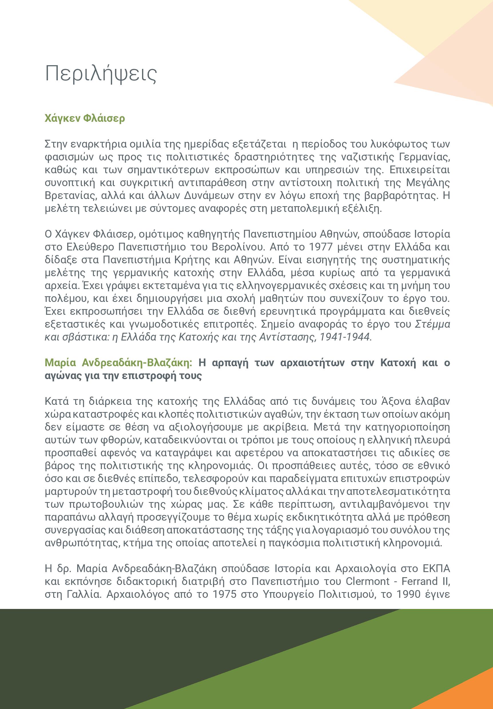 Κατά τη διάρκεια της κατοχής της Ελλάδας από τις δυνάμεις του άξονα έλαβαν χώρα καταστροφές και κλοπές πολιτιστικών αγαθών, την έκταση των οποίων ακόμη δεν είμαστε σε θέση να εκτιμήσουμε με ακρίβεια. Ύστερα από την κατηγοριοποίηση αυτών των φθορών, καταδεικνύονται οι τρόποι με τους οποίους η ελληνική πλευρά προσπαθεί αφενός να καταγράψει και αφετέρου να αποκαταστήσει τις αδικίες σε βάρος της πολιτιστικής της κληρονομιάς. Οι προσπάθειες αυτές, τόσο σε εθνικό όσο και σε διεθνές επίπεδο, τελεσφορούν και παραδείγματα επιτυχών επιστροφών μαρτυρούν τη μεταστροφή του διεθνούς κλίματος αλλά και την αποτελεσματικότητα των πρωτοβουλιών της χώρας μας. Σε κάθε περίπτωση, αντιλαμβανόμενοι την παραπάνω αλλαγή προσεγγίζουμε το θέμα χωρίς εκδικητικότητα αλλά με πρόθεση συνεργασίας και διάθεση αποκατάστασης της τάξης για λογαριασμό του συνόλου της ανθρωπότητας, κτήμα της οποίας αποτελεί η παγκόσμια πολιτιστική κληρονομιά.