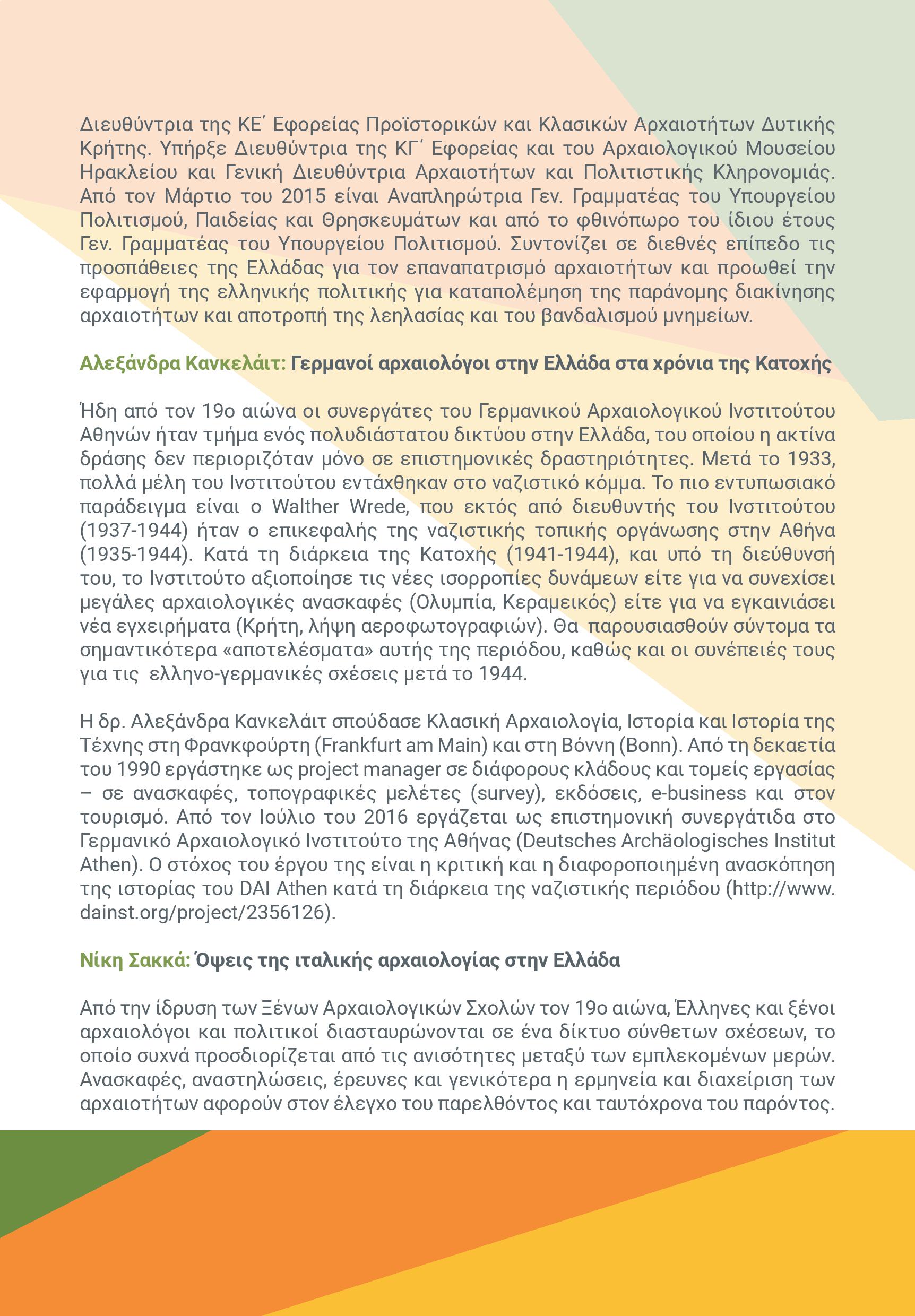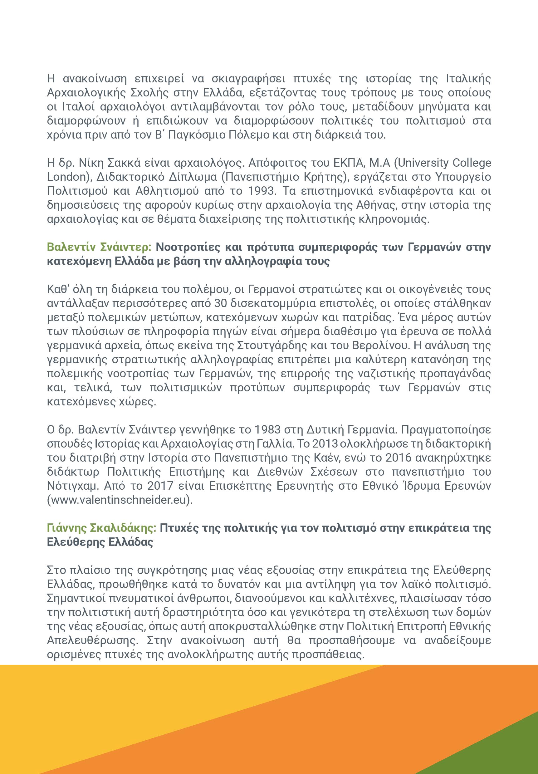 Από την ίδρυση των Ξένων Αρχαιολογικών Σχολών τον 19ο αιώνα, Έλληνες και ξένοι αρχαιολόγοι και πολιτικοί διασταυρώνονται σε ένα δίκτυο σύνθετων σχέσεων το οποίο συχνά προσδιορίζεται από τις ανισότητες μεταξύ των εμπλεκομένων μερών. Ανασκαφές, αναστηλώσεις, έρευνες και γενικότερα η ερμηνεία και διαχείριση των αρχαιοτήτων αφορούν στον έλεγχο του παρελθόντος και ταυτόχρονα του παρόντος. Η ανακοίνωση επιχειρεί να σκιαγραφήσει πτυχές της ιστορίας της Ιταλικής Αρχαιολογικής Σχολής στην Ελλάδα, εξετάζοντας τους τρόπους με τους οποίους οι Ιταλοί αρχαιολόγοι αντιλαμβάνονται τον ρόλο τους, μεταδίδουν μηνύματα και διαμορφώνουν ή επιδιώκουν να διαμορφώσουν πολιτικές του πολιτισμού στα χρόνια πριν τον Β΄ Παγκόσμιο Πόλεμο και στη διάρκεια του.