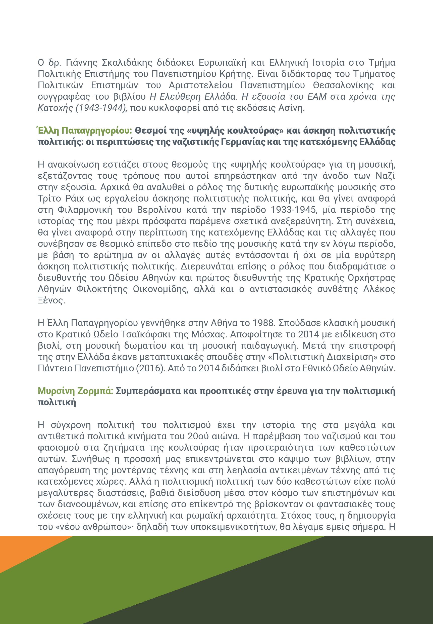 Η ανακοίνωση εστιάζει στους θεσμούς της «υψηλής κουλτούρας» για τη μουσική, εξετάζοντας τους τρόπους που αυτοί επηρεάστηκαν από την άνοδο των Ναζί στην εξουσία. Αρχικά θα αναλυθεί ο ρόλος της δυτικής ευρωπαϊκής μουσικής στο Τρίτο Ράιχ ως εργαλείο άσκησης πολιτιστικής πολιτικής, και θα γίνει αναφορά στη Φιλαρμονική του Βερολίνου κατά την περίοδο 1933-1945, μία περίοδο της ιστορία της που μέχρι πρόσφατα παρέμενε σχετικά ανεξερεύνητη. Στη συνέχεια, θα γίνει αναφορά στην περίπτωση της κατεχόμενης Ελλάδας και τις αλλαγές που συνέβησαν σε θεσμικό επίπεδο στο πεδίο της μουσικής κατά την εν λόγω περίοδο, με βάση το ερώτημα αν οι αλλαγές αυτές εντάσσονται ή όχι σε μία ευρύτερη άσκηση πολιτιστικής πολιτικής. Διερευνάται επίσης ο ρόλος που διαδραμάτισε ο διευθυντής του Ωδείου Αθηνών και πρώτος διευθυντής της Κρατικής Ορχήστρας Αθηνών Φιλοκτήτης Οικονομίδης, αλλά και ο αντιστασιακός συνθέτης Αλέκος Ξένος.