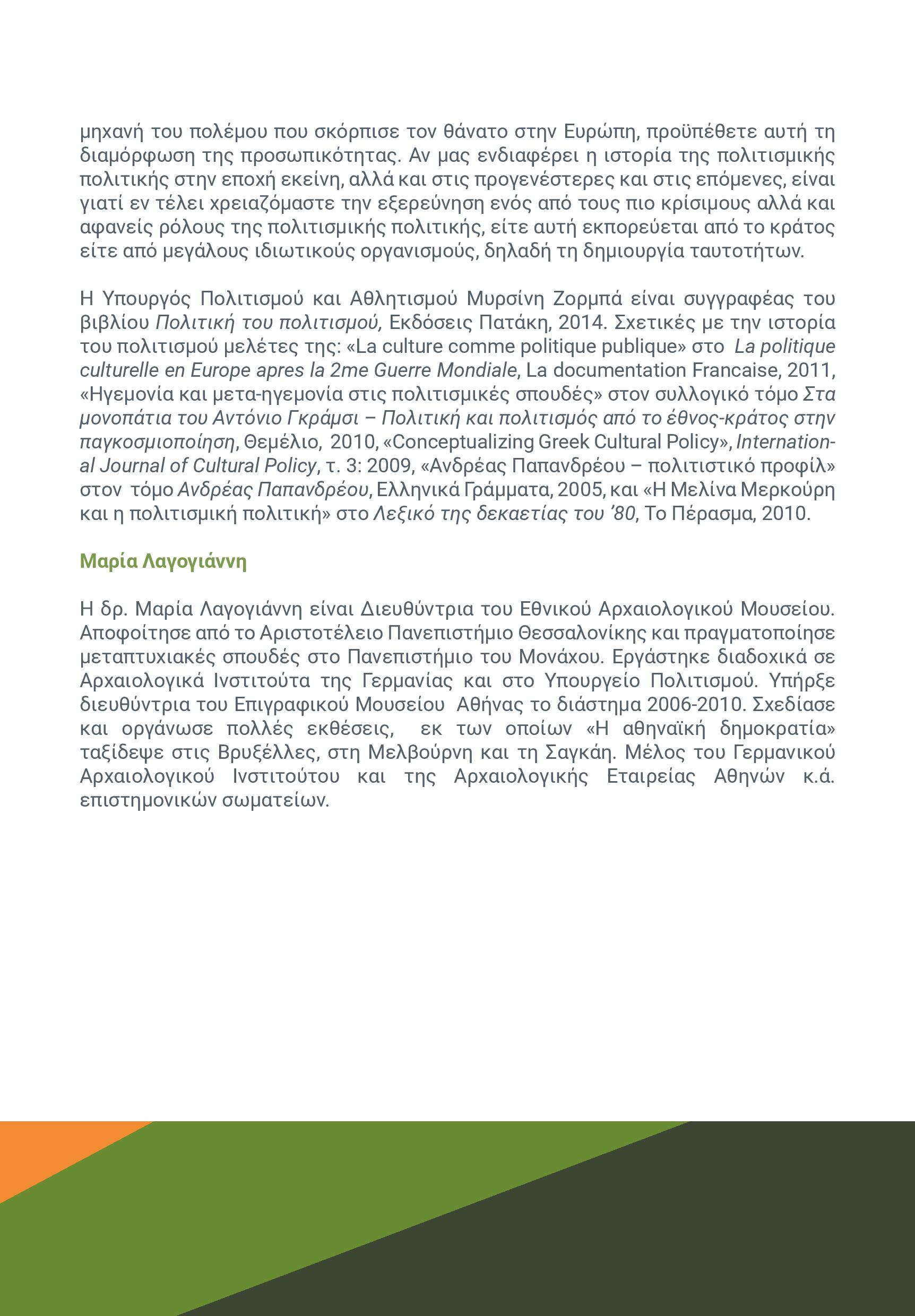 Η Υπουργός Πολιτισμού και Αθλητισμού Μυρσίνη Ζορμπά είναι συγγραφέας του βιβλίου Πολιτική του πολιτισμού, Εκδόσεις Πατάκη, 2014. Σχετικές με την ιστορία του πολιτισμού μελέτες της: «La culture comme politique publique» στο La politique culturelle en Europe apres la 2me Guerre Mondiale, La documentation Francaise, 2011, «Ηγεμονία και μετα-ηγεμονία στις πολιτισμικές σπουδές» στον συλλογικό τόμο Στα μονοπάτια του Αντόνιο Γκράμσι – Πολιτική και πολιτισμός από το έθνος-κράτος στην παγκοσμιοποίηση, Θεμέλιο 2010, «Conceptualizing Greek Cultural Policy», International Journal of Cultural Policy, τ. 3: 2009, «Ανδρέας Παπανδρέου – πολιτιστικό προφίλ» στον τόμο Ανδρέας Παπανδρέου, Ελληνικά Γράμματα, 2005, και «Η Μελίνα Μερκούρη και η πολιτισμική πολιτική» στο Λεξικό της δεκαετίας του ’80, Το Πέρασμα, 2010.
