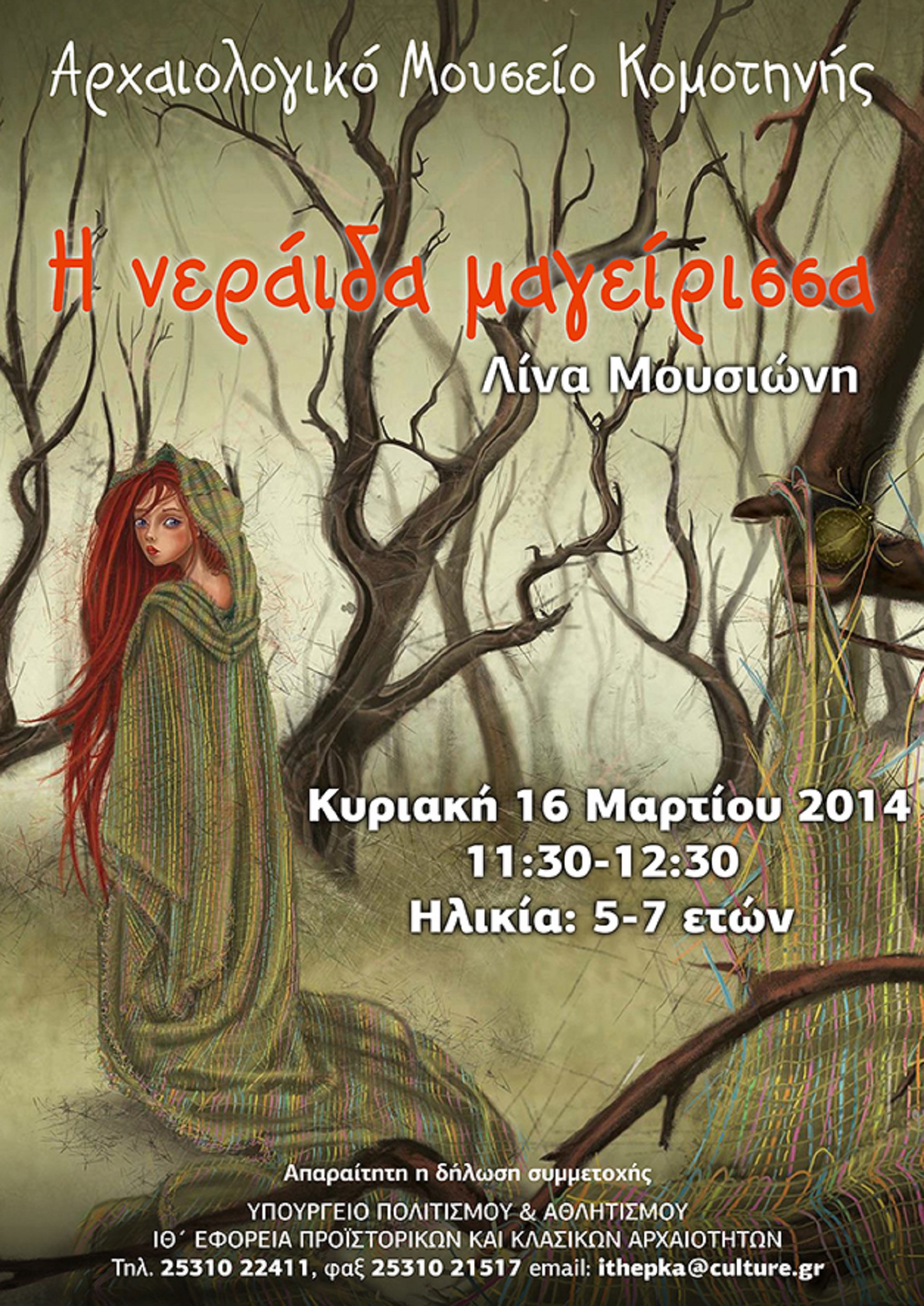 Νεράιδες χορεύουν με πολύχρωμα μαντήλια, εξερευνητές φωτογραφίζουν με κουκουναρομηχανές και οι μικροί επισκέπτες του Αρχαιολογικού Μουσείου Κομοτηνής αναζητούν αρχαία μαγειρικά σκεύη προκειμένου να ετοιμάσουν τη μυστική συνταγή. Τι χρειάζεσαι για να φτιάξεις μια πεντανόστιμη αρχαία σούπα ευτυχίας; Χαμόγελα; τρυφερότητα; αγάπη; φίλους; αγκαλιές; 'Ίσως λίγη κανέλλα, μοσχοκάρυδο, πιπερόριζα, ροδοπέταλα, μια στάλα χρυσόσκονη και ...εεε δεν τα λέμε κι όλα...! Η νεράιδα μαγείρισσα επισκέπτεται το Αρχαιολογικό Μουσείο Κομοτηνής και το μεταμορφώνει σε αρχαίο δάσος με παιδιά και πολλά μανιτάρια. Θα διηγηθεί την ιστορία της, θα μαγειρέψει, θα ζωγραφίσει, θα παίξει, θα μάθει, θα αναζητήσει και θα ονειρευτεί. Ένα εκπαιδευτικό πρόγραμμα για παιδιά ηλικίας 5 έως 7 ετών βασισμένο στο βιβλίο της Λίνας Μουσιώνη με τίτλο «Η νεράιδα μαγείρισσα».