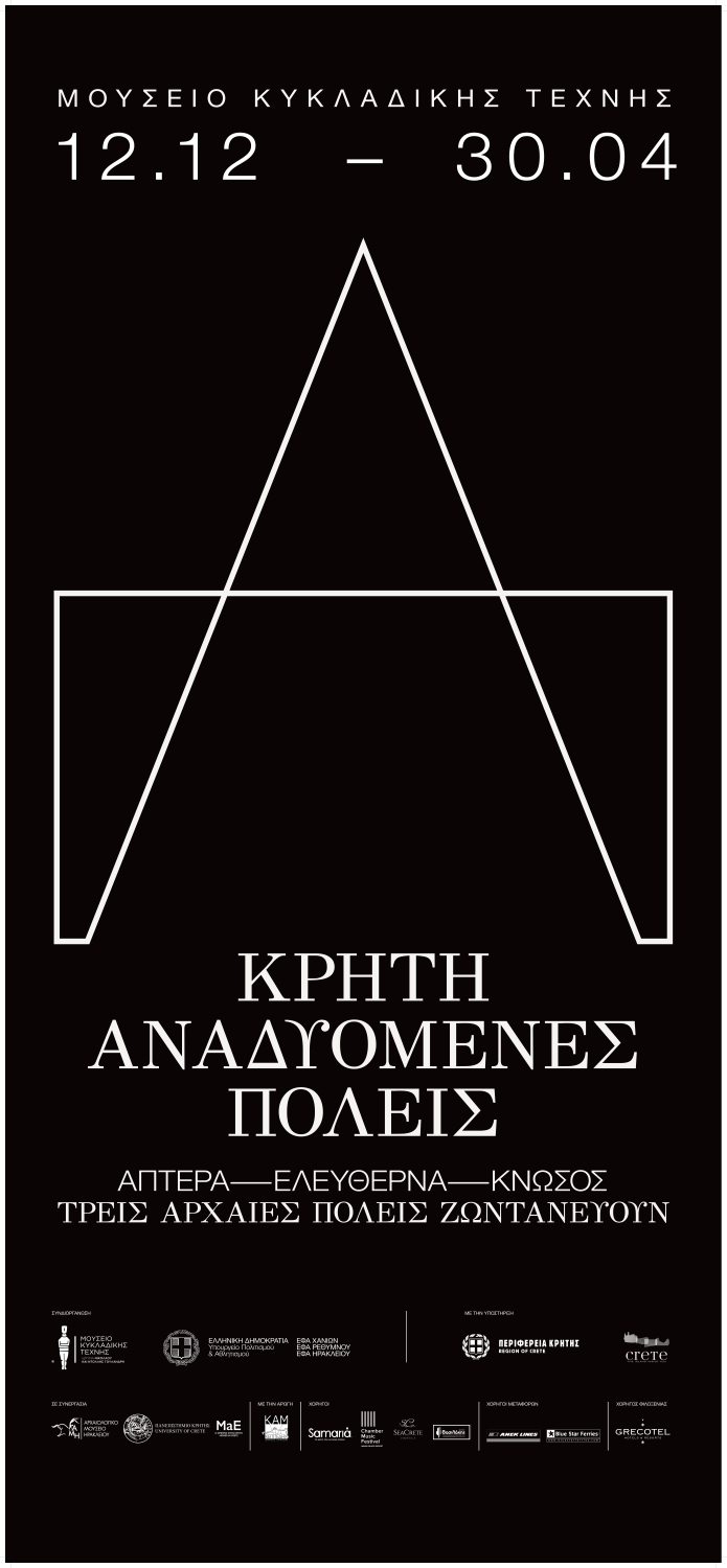Η Άπτερα, η Ελεύθερνα, η Κνωσός, τρεις εμβληματικές αρχαίες πόλεις της Κρήτης, με τη ζωντάνια και τον παλμό της παροντικότητας εκδιπλώνουν στον εκθεσιακό χώρο του Μουσείου Κυκλαδικής Τέχνης τις χιλιόχρονες πορείες τους, από την αίγλη και την ένταση της ακμής, στο λυκόφως της παρακμής τους.