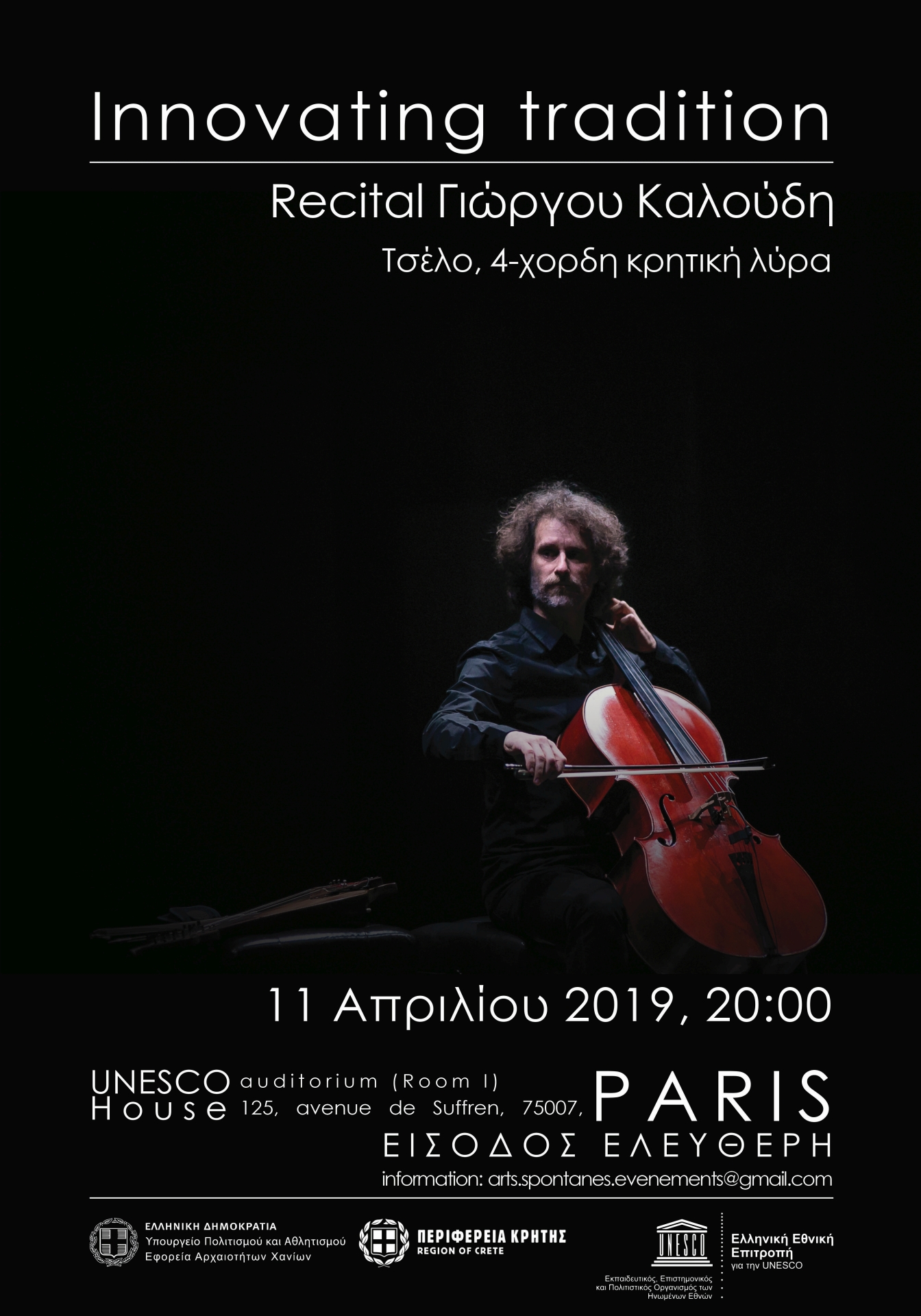 Η Εφορεία Αρχαιοτήτων Χανίων σε συνεργασία με την Περιφέρεια Κρήτης και την Ελληνική Εθνική Επιτροπή για την UNESCO παρουσιάζουν την Πέμπτη, 11 Απριλίου 2019 και ώρα 20:00 το ρεσιτάλ «Innovating Tradition» του Γιώργου Καλούδη (τσέλο, 4-χορδη κρητική λύρα) στο κεντρικό auditorium της UNESCO στο Παρίσι.
