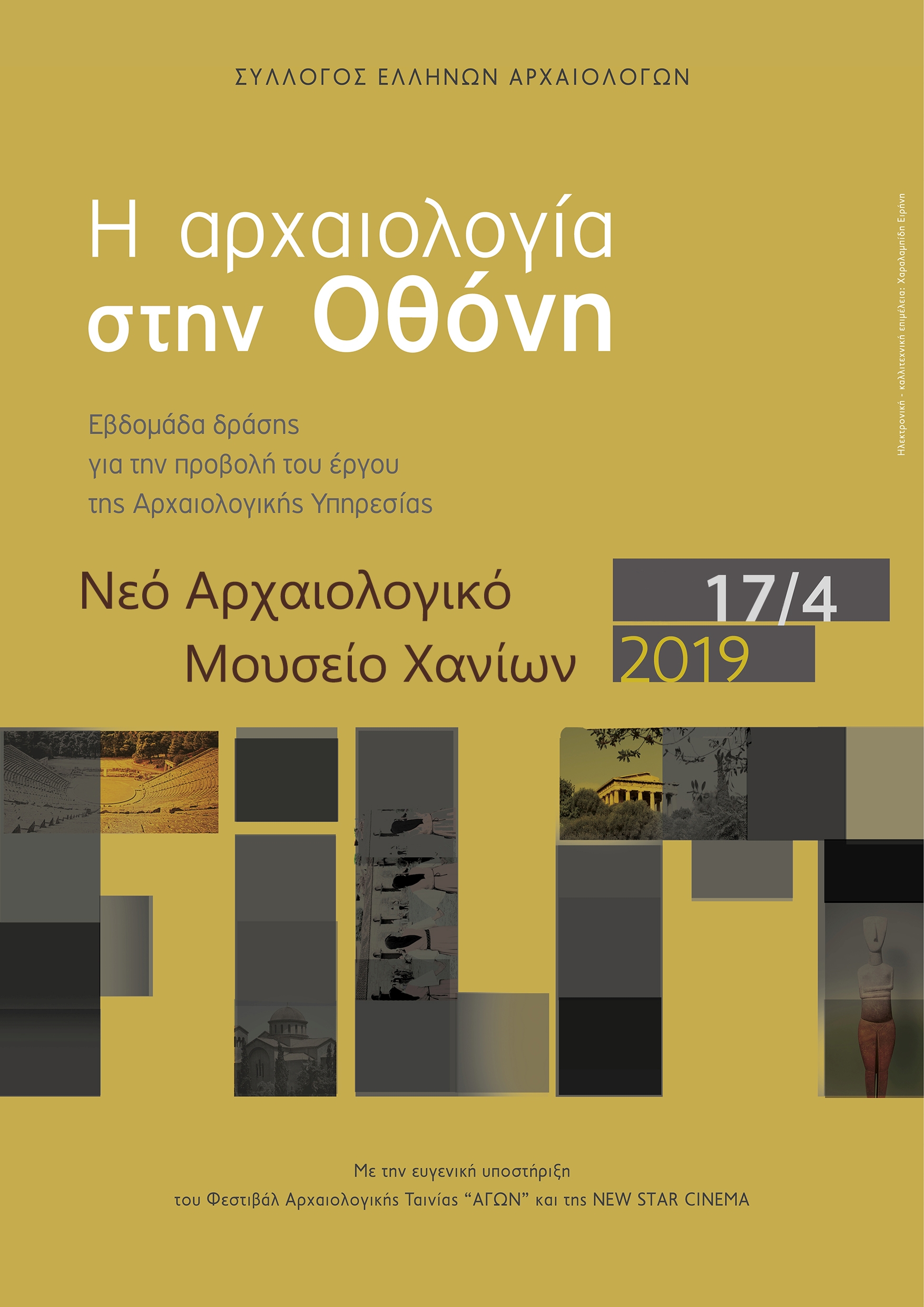 Η Εφορεία Αρχαιοτήτων Χανίων συμμετέχει στην εβδομάδα δράσης για την προβολή του έργου της Αρχαιολογικής Υπηρεσίας με θέμα "Η Αρχαιολογία στην Οθόνη", η οποία διοργανώνεται πανελλαδικά από τον Σύλλογο Ελλήνων Αρχαιολόγων από τις 15 έως και τις 21 Απριλίου 2019. Από τις ιστορικές ταινίες της Cinecitta και τα αρχαιολογικά ντοκιμαντέρ ως τις κινηματογραφήσεις ταινιών και διαφημιστικών σε χώρους αρμοδιότητας του ΥΠ.ΠΟ.Α., οι αρχαιολογικοί χώροι και τα μνημεία είναι άρρηκτα συνδεδεμένα με την 7η Τέχνη, ήδη από τις απαρχές της. Άλλοτε ως σκηνικό και άλλοτε ως θέμα, η Αρχαιότητα και ο Μεσαίωνας αποτελούν αγαπημένα μοτίβα των μεγάλων κινηματογραφικών παραγωγών, ενώ ο διάλογος μεταξύ του κινηματογράφου και της Αρχαιολογίας είναι διαρκής και δυναμικός, καθώς το περιεχόμενο των ταινιών μεταβάλλεται και ποικίλει, ανάλογα με τις εξελίξεις.