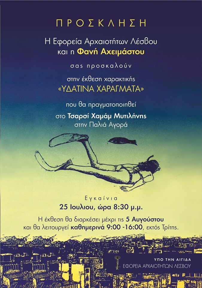 H Εφορεία Αρχαιοτήτων Λέσβου και η Φανή Αχειμάστου σας προσκαλούν στα εγκαίνια της έκθεσης χαρακτικής "Υδάτινα Χαράγματα", που θα πραγματοποιηθεί στο Τσαρσί Χαμάμ της Μυτιλήνης, στην Παλαιά Αγορά, στις 25 Ιουλίου και ώρα 20:30.