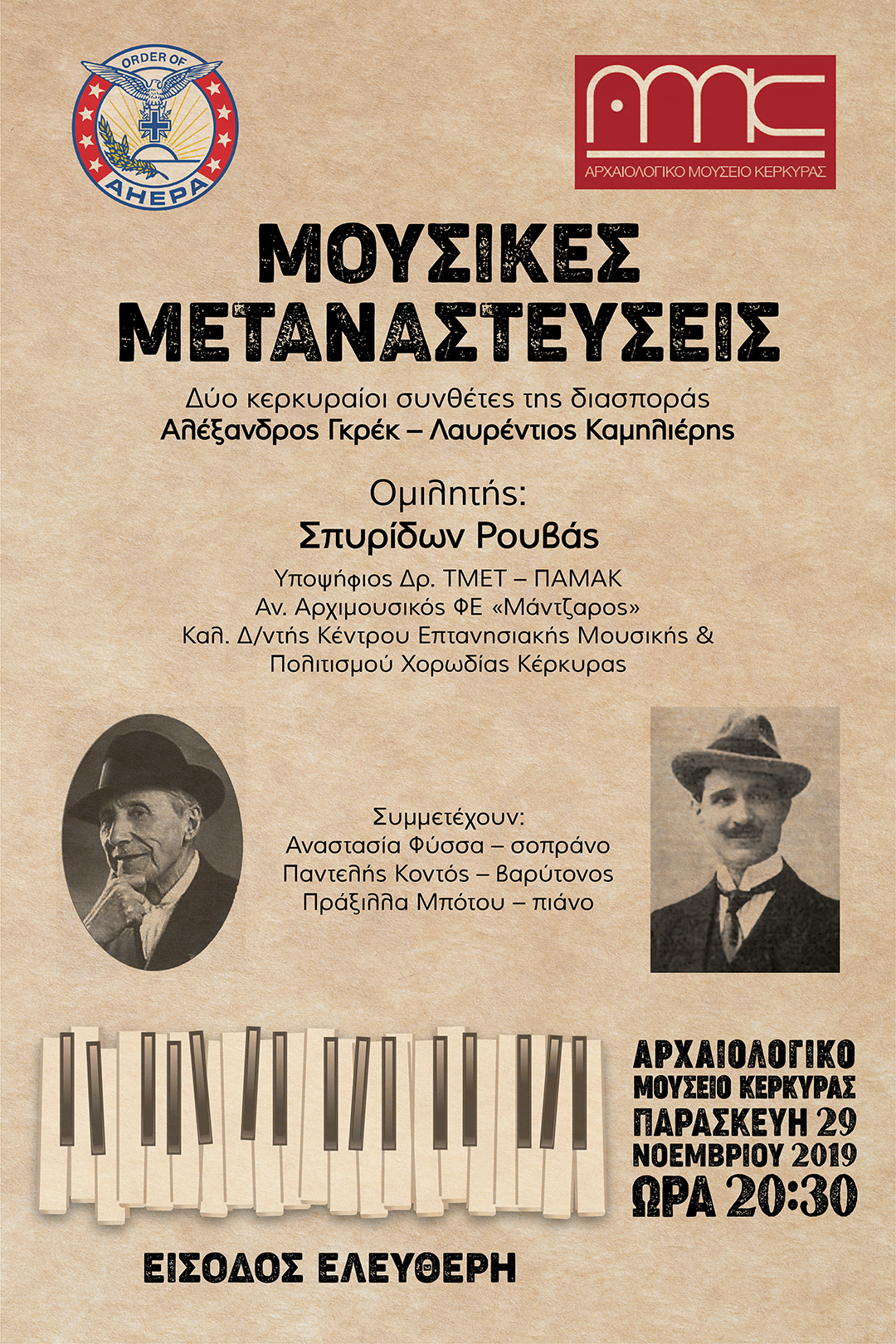 Η εκδήλωση είναι αφιερωμένη στη ζωή και το μουσικό έργο δύο Κερκυραίων συνθετών της διασποράς των Αλεξάνδρου Γκρεκ και Λαυρέντιου Καμηλιέρη. Το πρόγραμμα της εκδήλωσης περιλαμβάνει ομιλία από τον μουσικό κ. Σπύρο Ρουβά και εκτέλεση έργων των δύο σπουδαίων συνθετών από την σοπράνο κ. Αναστασία Φύσσα και τον βαρύτονο κ. Παντελή Κοντό συνοδευόμενους στο πιάνο από την κ. Πράξιλλα Μπότου.