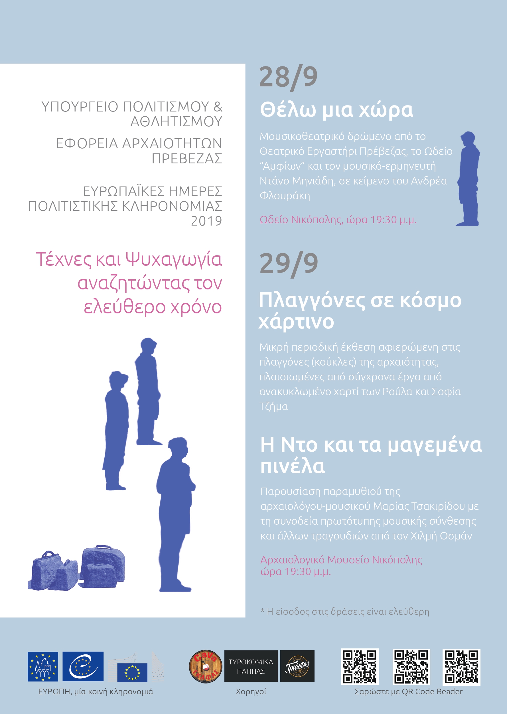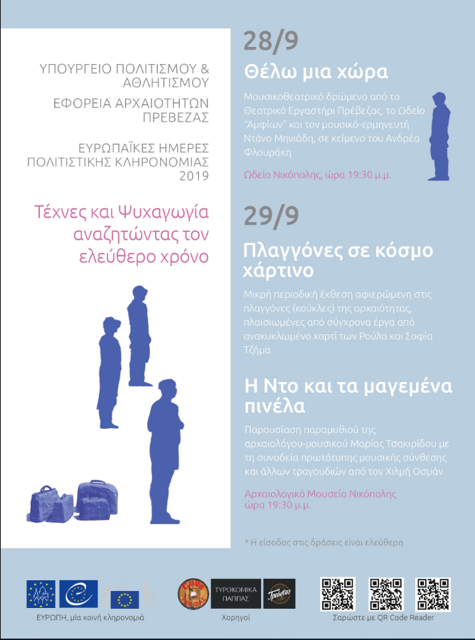 Στο πλαίσιο του εορτασμού των Ευρωπαϊκών Ημερών Πολιτιστικής Κληρονομιάς (ΕΗΠΚ)μ ένα ευρωπαϊκό πρόγραμμα που θεσπίστηκε από το Συμβούλιο της Ευρώπης το 1991, θα πραγματοποιηθεί μουσικοθεατρικό δρώμενο στο Ωδείο της Νικόπολης, τον κατεξοχήν χώρο φιλοξενίας καλλιτεχνικών εκδηλώσεων της αρχαιότητας. Με κυρίαρχο το σύνθημα «Θέλω μια χώρα» ο συγγραφέας Ανδρέας Φλουράκης μεταγράφει με χιούμορ και απελπισία όλες εκείνες τις φράσεις που ακούμε, λέμε και ξαναλέμε όταν μιλάμε για τη χώρα μας σήμερα. Στην παράσταση ο λόγος δίνεται κυρίως στη νέα γενιά. Μια γενιά αμήχανη απέναντι στη γενικότερη κρίση, που νιώθει την ανάγκη να ορίσει ποια είναι η χώρα που ονειρεύεται. Το έργο αποδίδεται ως θεατρικό αναλόγιο με τη συνοδεία μουσικής σε νοηματική συνάφεια με το κείμενο.