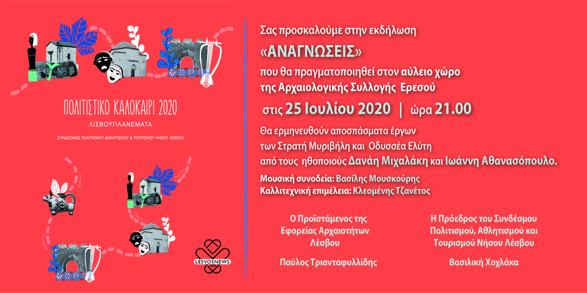 Η Εφορεία Αρχαιοτήτων Λέσβου και ο Σύνδεσμος Πολιτισμού, Αθλητισμού και Τουρισμού Νήσου Λέσβου σας προσκαλούν στην εκδήλωση που θα πραγματοποιηθεί το Σάββατο 25 Ιουλίου 2020 και ώρα 21:00, στον αύλειο χώρο της Αρχαιολογικής Συλλογής Ερεσού.