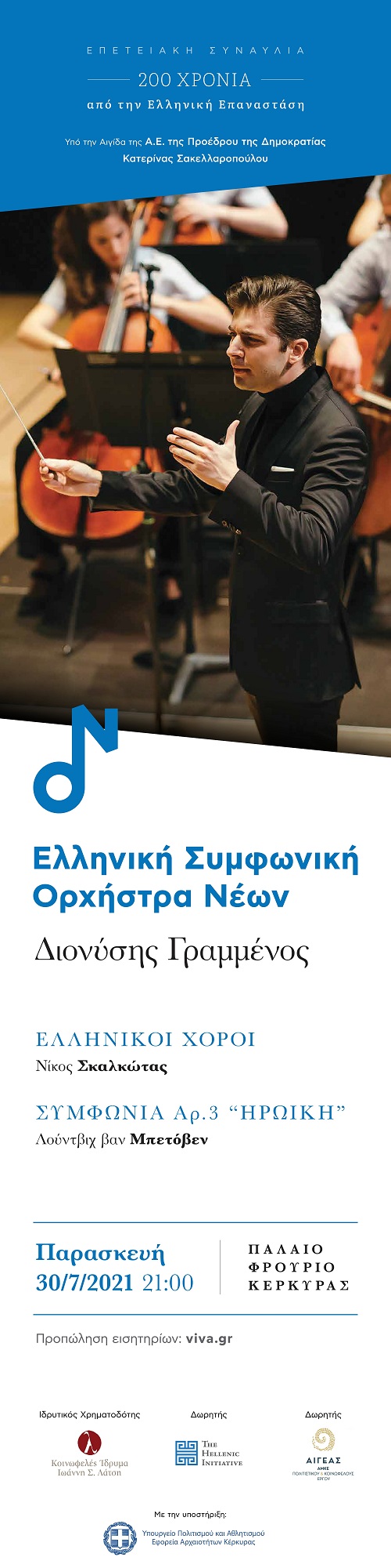 Υπό την Aιγίδα της Προέδρου της Δημοκρατίας και με την Υποστήριξη της Εφορείας Αρχαιοτήτων Κέρκυρας, η Ελληνική Συμφωνική Ορχήστρα Νέων θα δώσει επετειακή συναυλία - αφιέρωμα για τον εορτασμό των 200 χρόνων από την Ελληνική Επανάσταση υπό τη διεύθυνση του Κερκυραίου μουσικού Διονύση Γραμμένου στο Παλαιό Φρούριο Κέρκυρας την Παρασκευή 30.07.2021 και ώρα 21:00.