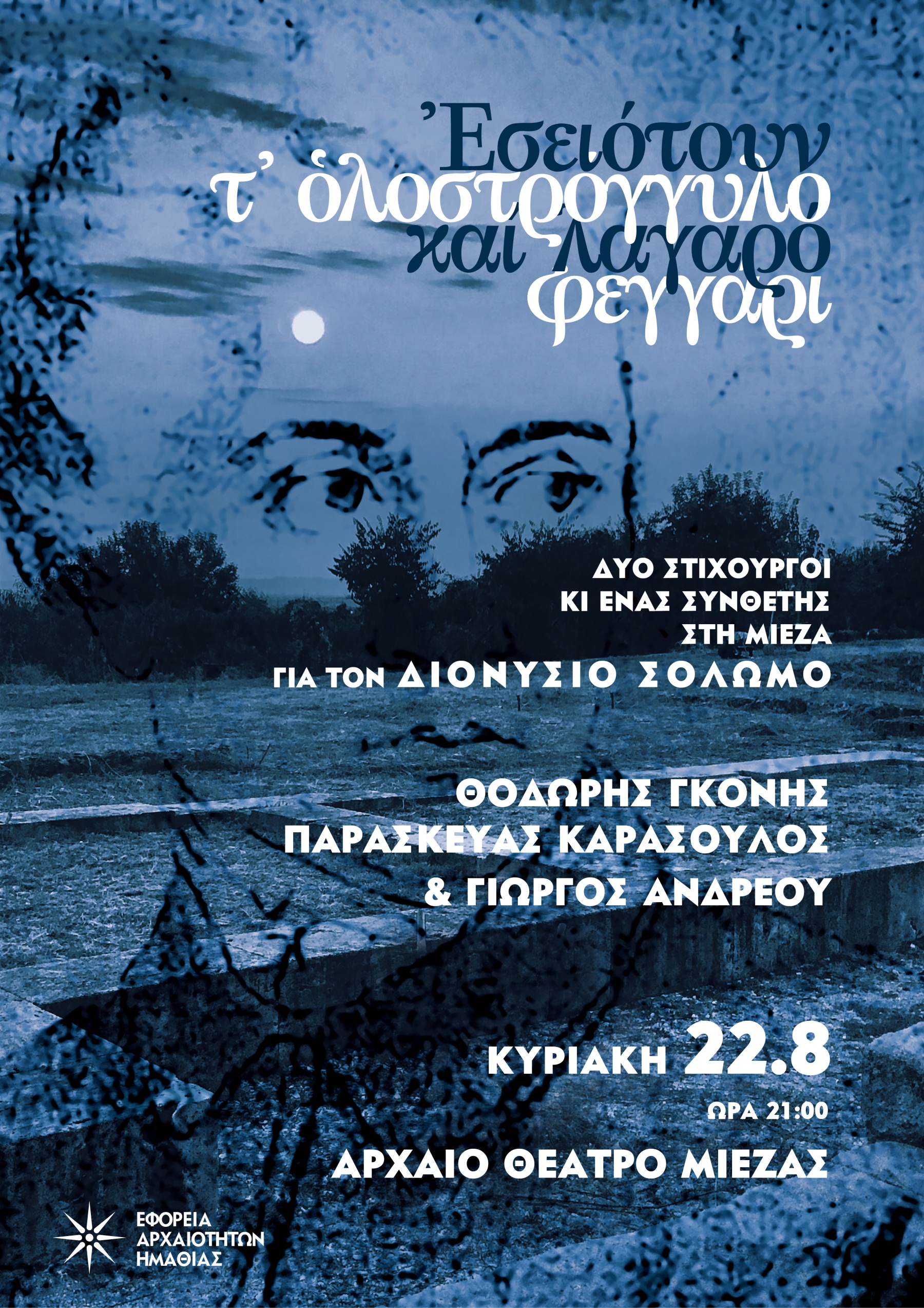 Δύο στιχουργοί, ο Θοδωρής Γκόνης και ο Παρασκευάς Καρασούλος συναντιούνται στο αρχαίο θέατρο της Μίεζας την Πανσέληνο του Αυγούστου, φέρνοντας ο καθένας ένα μικρό ανθολόγιο από το έργο του Διονυσίου Σολωμού.