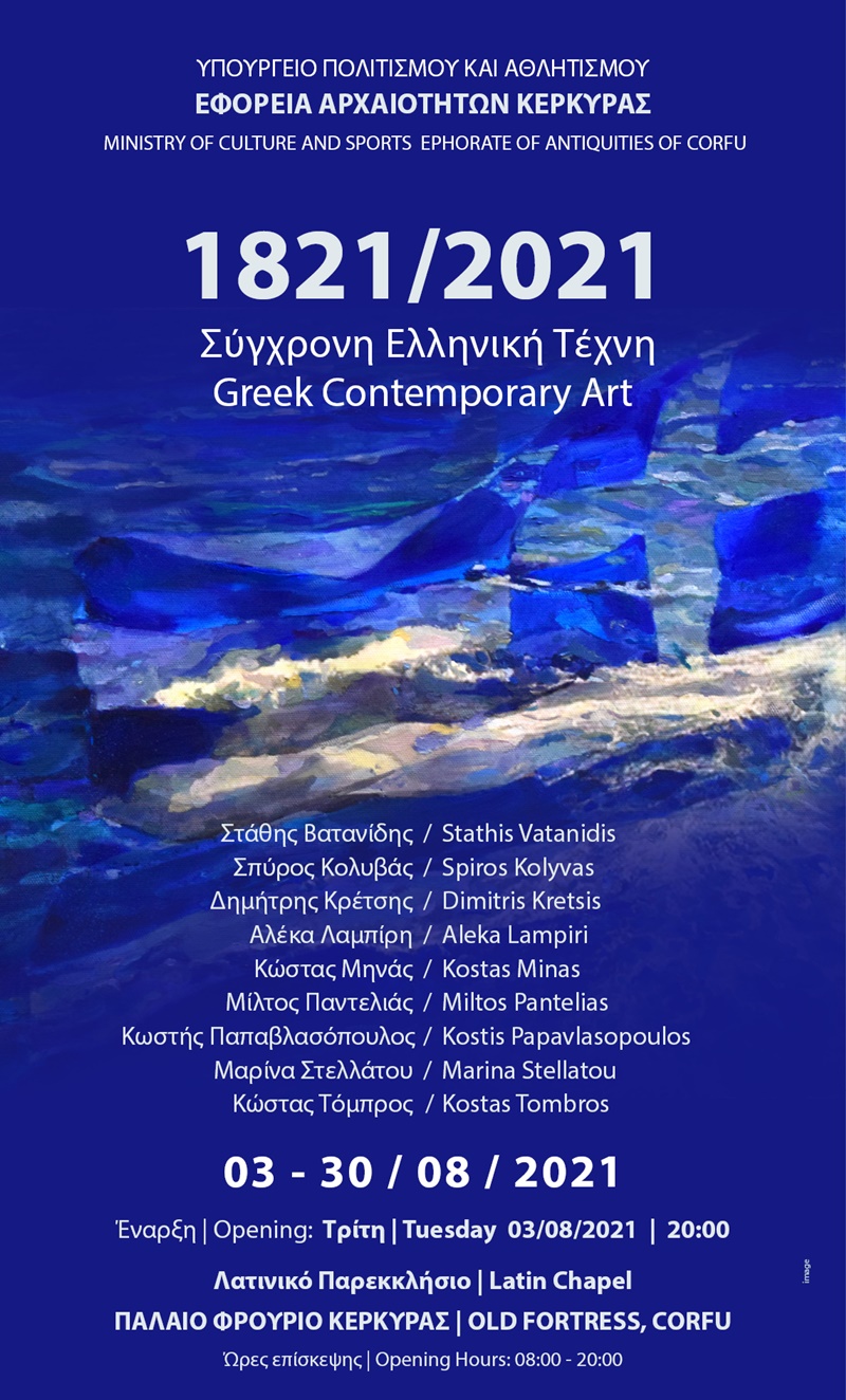 Την Τρίτη, 3 Αυγούστου στις 20:00, εγκαινιάζεται στο Λατινικό Παρεκκλήσιo του Παλαιού Φρουρίου, η ομαδική έκθεση ζωγραφικής “1821/2021 Σύγχρονη Ελληνική Τέχνη”, η οποία εντάσσεται στον εορτασμό της επετείου από τα 200 χρόνια της Ελληνικής Επανάστασης.