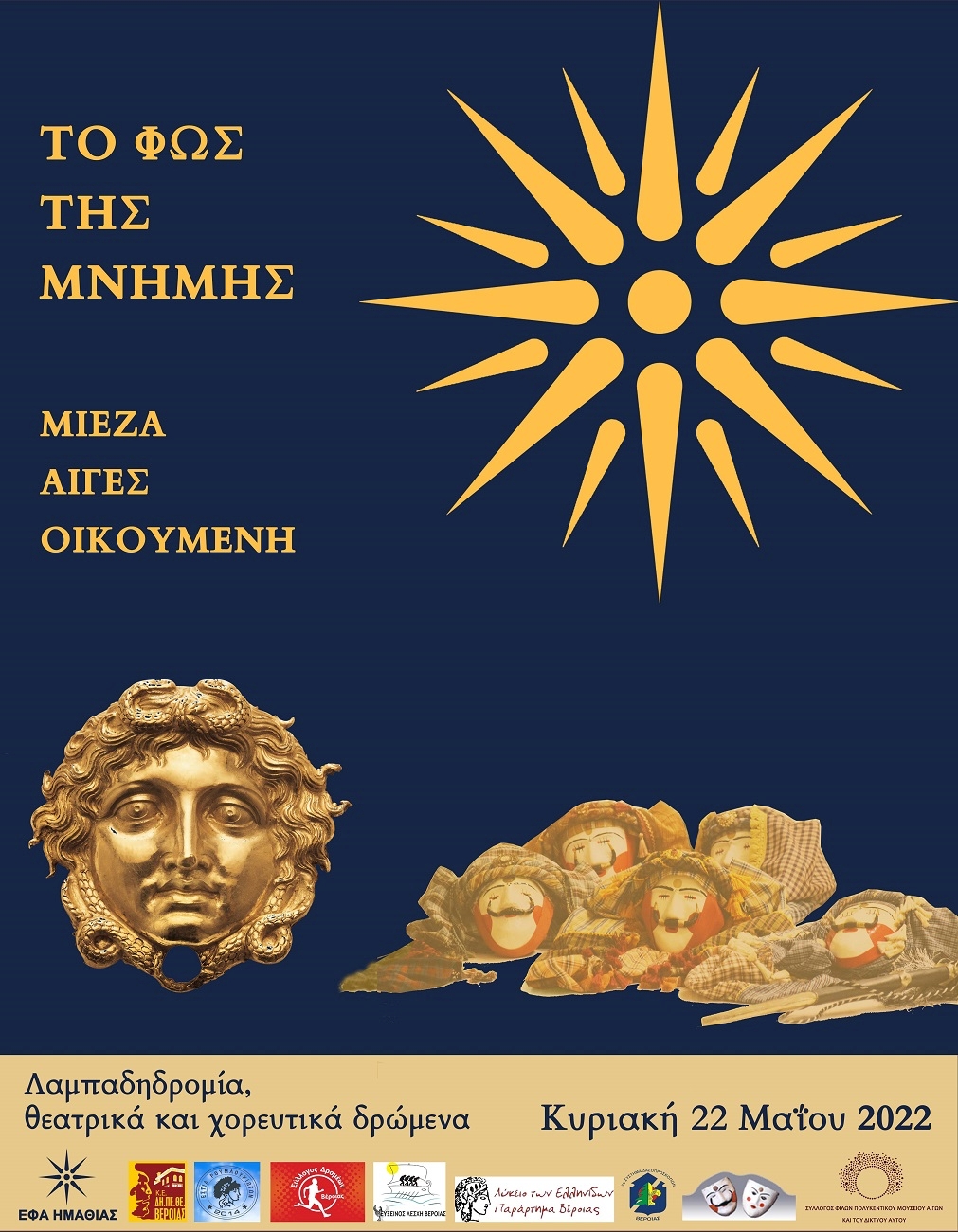 Ειδικότερα, την Κυριακή 22 Μάϊου 2022 ενώνουμε γιορτές -την μέρα των μουσείων και τις «πράσινες πολιτιστικές διαδρομές»- και ενώνουμε δυνάμεις – η Εφορεία Αρχαιοτήτων Ημαθίας, ο Σύλλογος των Φίλων του Πολυκεντρικού Μουσείου των Αιγών και του Δικτύου του, το ΔΗ.ΠΕ.ΘΕ. Βέροιας, ο «Σύλλογος Δρομέων Βέροιας», το Λύκειο Ελληνίδων Βέροιας, ο όμιλος «Γενίτσαροι και Μπούλες Νάουσας», η «Εστία Ρουμλουκιωτών Αλεξάνδρειας», η «Εύξεινος Λέσχη Βέροιας» και το 3ο Σύστημα Προσκόπων Βέροιας– και γιορτάζουμε όπως οι αρχαίοι με μια μαραθώνια λαμπαδηδρομία 40 χιλιομέτρων, με μουσικές, χορούς και θεατρικά δρώμενα την μνήμη των Μακεδόνων που ξεκινώντας από αυτά τα χώματα άλλαξαν την ιστορία του κόσμου! Αναλυτικό πρόγραμμα των εκδηλώσεων στο Δελτίο Τύπου που ακολουθεί.