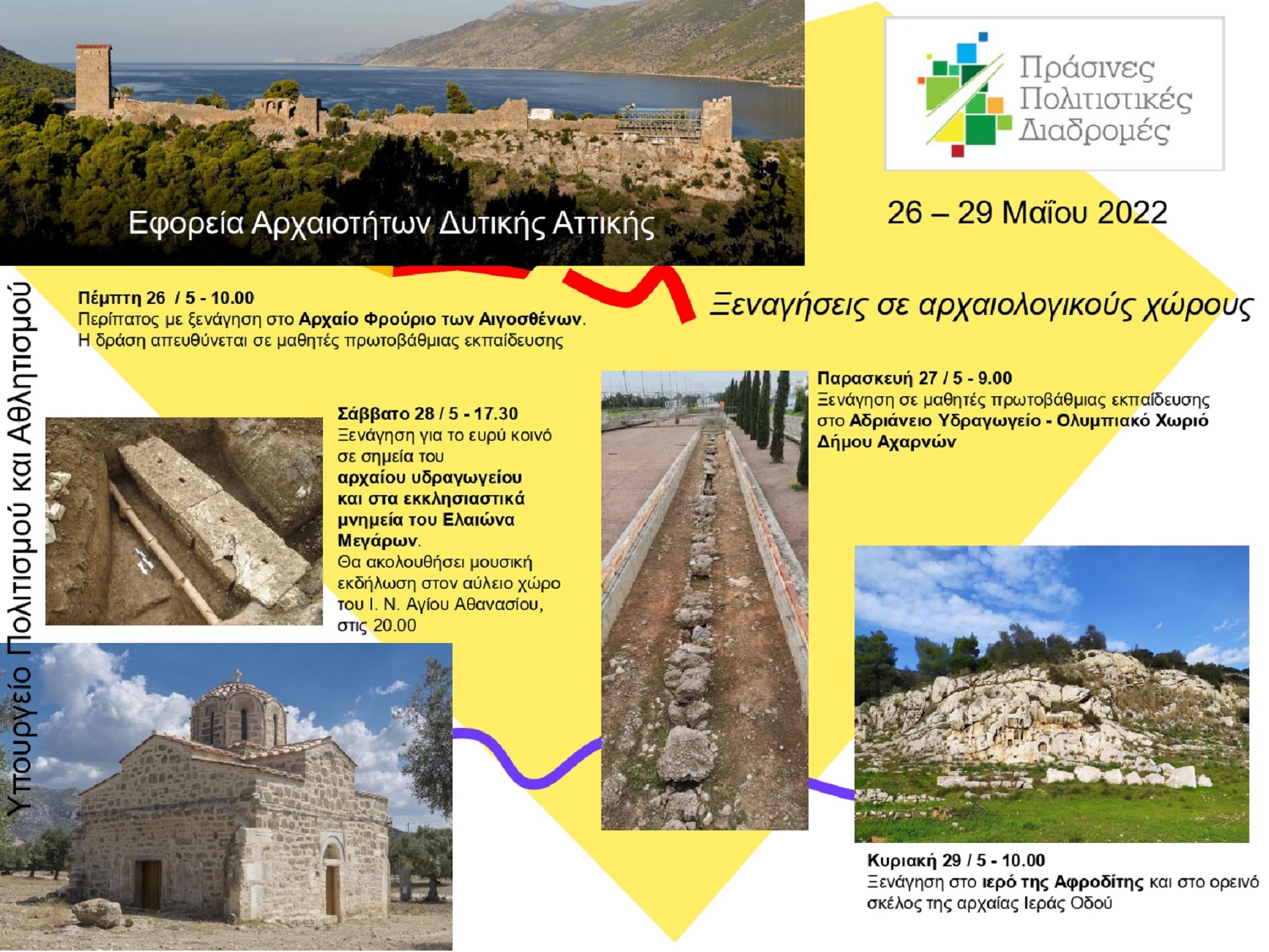 Η Εφορεία Αρχαιοτήτων Δυτικής Αττικής, στο πλαίσιο της επικοινωνιακής δράσης «ΠράσινεςΠολιτιστικές Διαδρομές 2022» στις 26 -29 Μαΐου 2022, διοργανώνει τις εξής δράσεις: