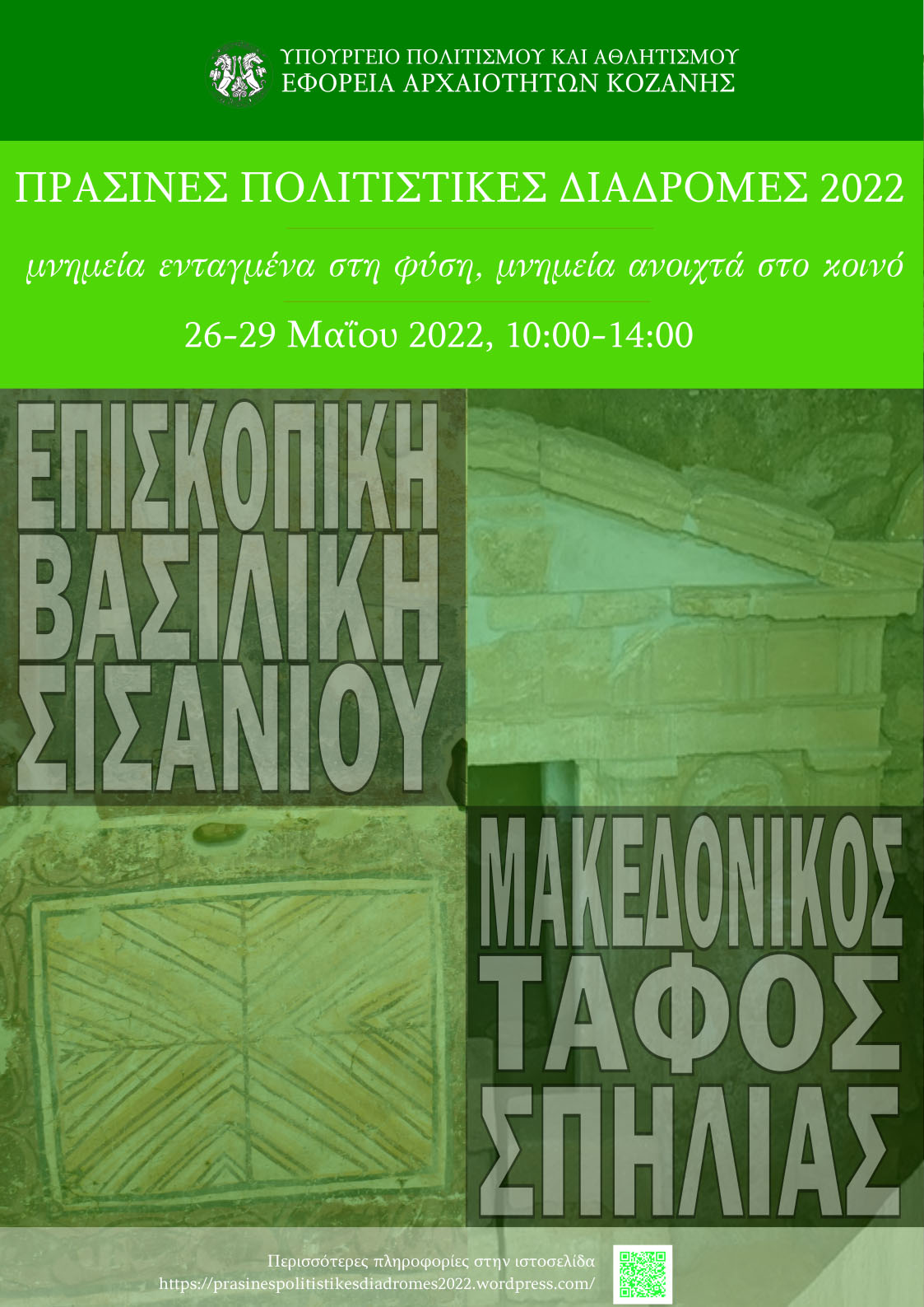 Η Εφορεία Αρχαιοτήτων Κοζάνης, σε συνεργασία με τον Δήμο Βοΐου, τον Δήμο Εορδαίας και την Ιερά Μητρόπολη Σισανίου και Σιατίστης, συμμετέχει και φέτος στην επικοινωνιακή δράση «Πράσινες Πολιτιστικές Διαδρομές», που τελεί υπό την αιγίδα του Τμήματος Εκπαιδευτικών Προγραμμάτων και Επικοινωνίας της Διεύθυνσης Αρχαιολογικών Μουσείων, Εκθέσεων και Εκπαιδευτικών Προγραμμάτων του Υπουργείου Πολιτισμού και Αθλητισμού, με τη διοργάνωση της δράσης «Μνημεία Ενταγμένα στη Φύση, Μνημεία ανοιχτά στο Κοινό» που περιλαμβάνει σειρά επισκέψεων και ξεναγήσεων σε δύο μνημεία ιδιαίτερης αρχαιολογικής σημασίας της Π.Ε. Κοζάνης: τον Μακεδονικό Τάφο Σπηλιάς Εορδαίας και την Επισκοπική Βασιλική Σισανίου Βοΐου. Τα δύο αυτά μνημεία, τα οποία είναι συνήθως ανοιχτά μόνο κατόπιν προσυνεννόησης, θα παραμείνουν ανοιχτά για το κοινό με την παρουσία φυλάκων από τις 10:00 έως τις 14:00 για το χρονικό διάστημα από την Πέμπτη 26 έως και την Κυριακή 29 Μαΐου 2022.