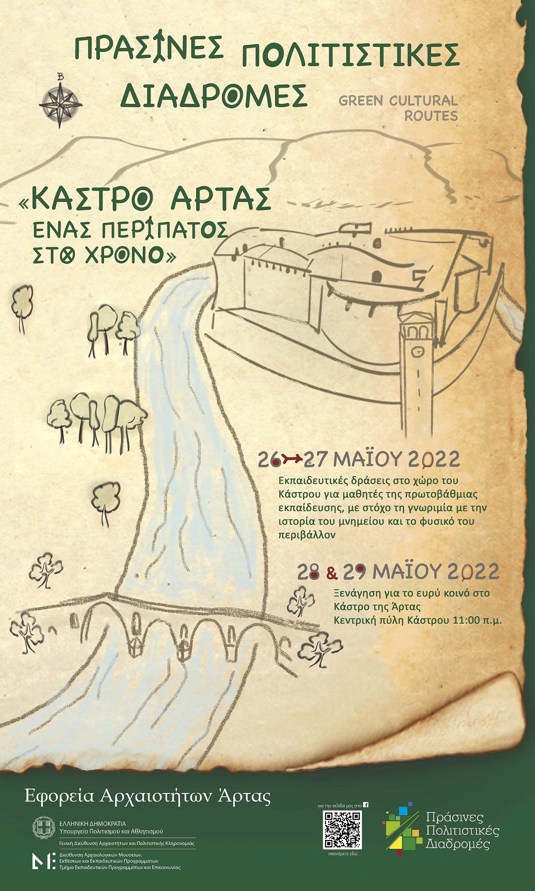 Η Εφορεία Αρχαιοτήτων Άρτας συμμετέχει στις Πράσινες Πολιτιστικές Διαδρομές 2022, την πανελλήνια επικοινωνιακή δράση που διοργανώνεται από το Υπουργείο Πολιτισμού και Αθλητισμού από το 2012, αποσκοπώντας στην ευαισθητοποίηση των πολιτών σε θέματα προστασίας και ανάδειξης του πολιτιστικού πλούτου και του φυσικού περιβάλλοντος της χώρας.