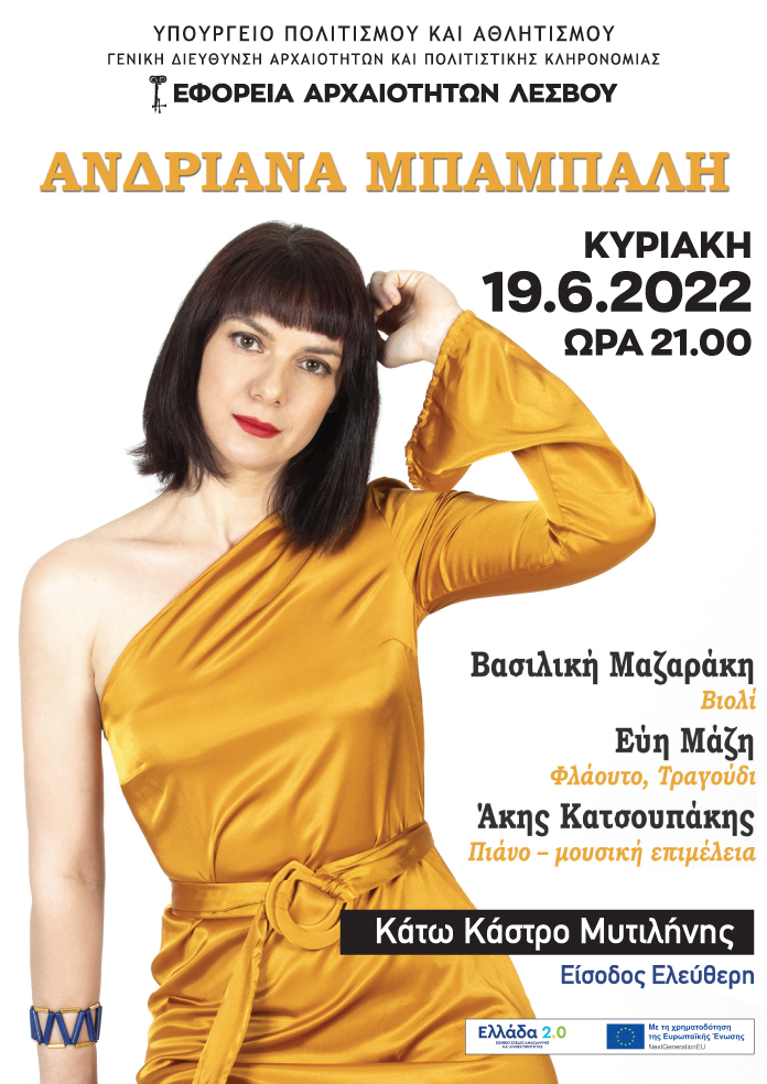 Η Εφορεία Αρχαιοτήτων Λέσβου στο πλαίσιο της δημοσιότητας του έργου «Αποκατάσταση Βορειοανατολικού Περιβόλου Κάστρου Μυτιλήνης (περιοχή Δ έως Βυζαντινή Δεξαμενή)» που έχει ενταχθεί στο Ταμείο Ανάκαμψης και Ανθεκτικότητας, διοργανώνει την πολιτιστική εκδήλωση Ανδριάνα Μπάμπαλη Quartet, που θα πραγματοποιηθεί στο Κάτω Κάστρο Μυτιλήνης, Κυριακή 19 Ιουνίου 2022 και ώρα 21.00.