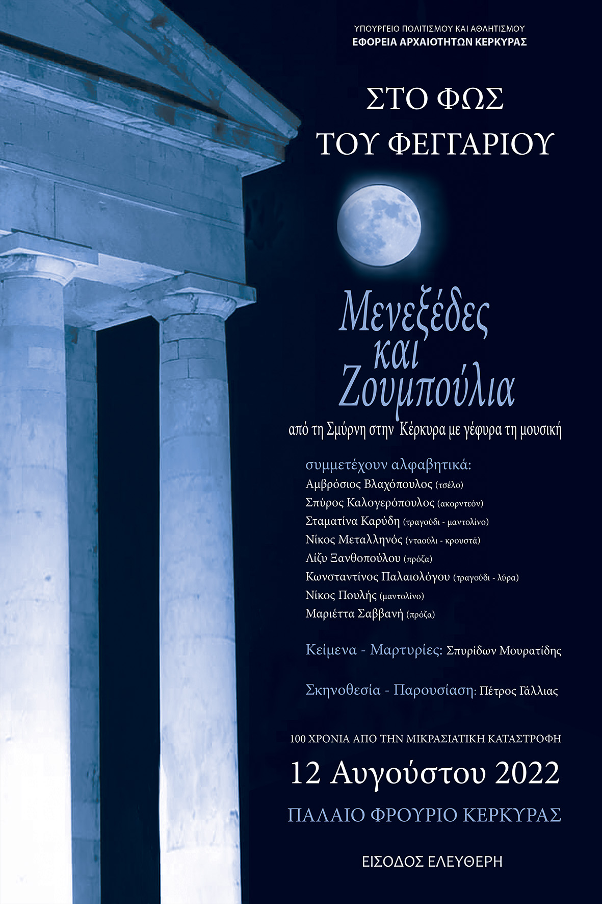 Η Εφορεία Αρχαιοτήτων Κέρκυρας, στο πλαίσιο του εορτασμού της Αυγουστιάτικης Πανσελήνου του Υπουργείου Πολιτισμού και Αθλητισμού, θα παρουσιάσει την Παρασκευή 12 Αυγούστου 2022, στις 22:30, στο Παλαιό Φρούριο Κέρκυρας την μουσική εκδήλωση