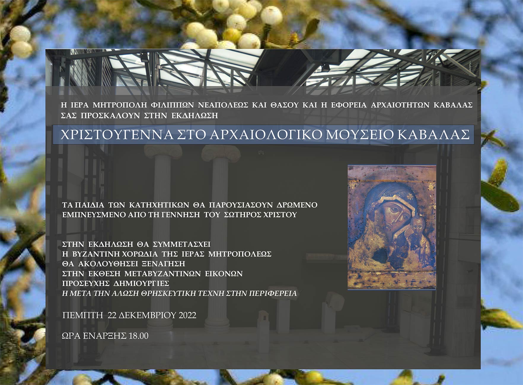Η Ιερά Μητρόπολη Φιλίππων Νεαπόλεως και Θάσου και η Εφορεία Αρχαιοτήτων Καβάλας σας προσκαλούν στην εκδήλωση Χριστούγεννα στο Αρχαιολογικό Μουσείο Καβάλας.