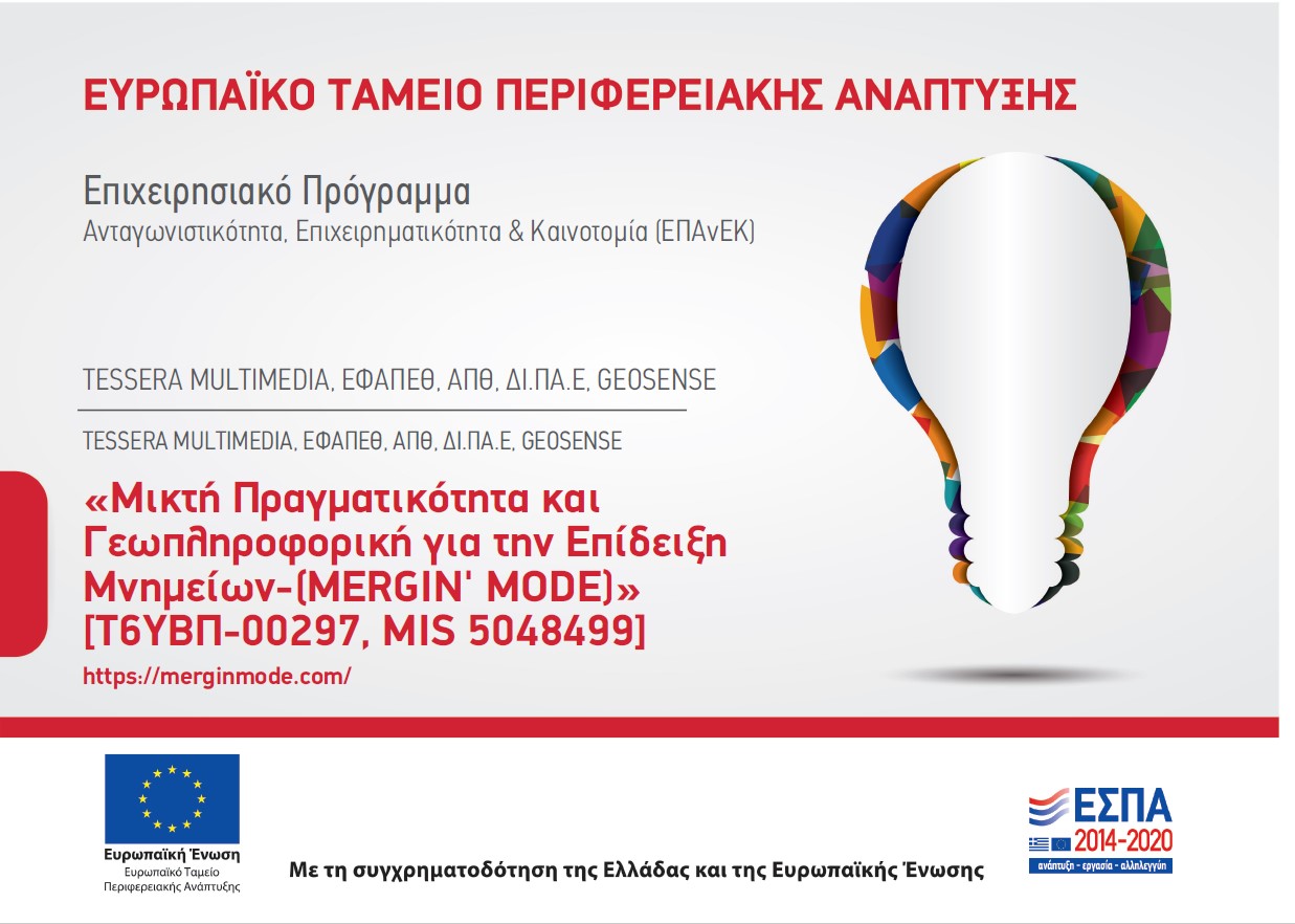 Το έργο με τίτλο «Μικτή Πραγματικότητα και Γεωπληροφορική για την Επίδειξη Μνημείων» και ακρωνύμιο MERGIN' MODE υλοποιείται στο πλαίσιο των ειδικών δράσεων «ΥΔΑΤΟΚΑΛΛΙΕΡΓΕΙΕΣ» - «ΒΙΟΜΗΧΑΝΙΚΑ ΥΛΙΚΑ» - «ΑΝΟΙΧΤΗ ΚΑΙΝΟΤΟΜΙΑ ΣΤΟΝ ΠΟΛΙΤΙΣΜΟ» και συγχρηματοδοτείται από το Ευρωπαϊκό Ταμείο Περιφερειακής Ανάπτυξης (ΕΤΠΑ) της Ευρωπαϊκής Ένωσης και από εθνικούς πόρους μέσω του Επιχειρησιακού Προγράμματος «Ανταγωνιστικότητα, Επιχειρηματικότητα & Καινοτομία (ΕΠΑνΕΚ) του ΕΣΠΑ 2014-2020. Το ερευνητικό έργο MERGIN' MODE αποτελεί ένα Πολιτιστικό Πληροφοριακό Σύστημα (Cultural Information System) που αποσκοπεί στην επίδειξη μνημείων (MOnument DEmonstration), μέσα από τη συγχώνευση (MERGIN') του πραγματικού με το εικονικό, σε μια Μικτή Πραγματικότητα (MixEd Reality) επικουρούμενη από τεχνολογίες Γεωπληροφορικής (GeoINformatics).