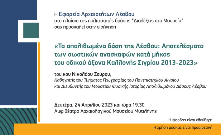 Η Εφορεία Αρχαιοτήτων Λέσβου στο πλαίσιο της πολιτιστικής της δράσης "Διαλέξεις στο Μουσείο", σας προσκαλεί, την Δευτέρα, 24 Απριλίου 2023 και ώρα 19.30, στην εισήγηση του καθηγητή Γεωγραφίας του Πανεπιστημίου Αιγαίου και Διευθυντή του Μουσείου Φυσικής Ιστορίας Απολιθωμένου Δάσους Λέσβου κου Νικολάου Ζούρου "Τα απολιθωμένα δάση της Λέσβου: Αποτελέσματα των σωστικών ανασκαφών κατά μήκος του οδικού άξονα Καλλονής Σιγρίου 2013-2023".