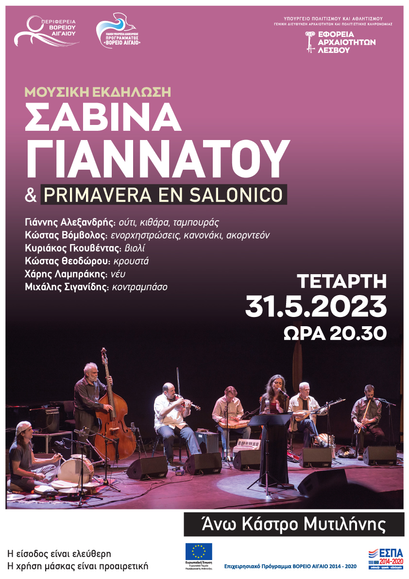 Η Εφορεία Αρχαιοτήτων Λέσβου, η Περιφέρεια Βορείου Αιγαίου και η Ειδική Υπηρεσία Διαχείρισης Βορείου Αιγαίου σας προσκαλούν την Τετάρτη, 31 Μαΐου 2023 και ώρα 20.30 στο Άνω Κάστρο Μυτιλήνης, στην μουσική εκδήλωση με τη Σαβίνα Γιαννάτου και τους Primavera en Salonico, σε μια μουσική πανδαισία ακουσμάτων από όλο τον κόσμο.
