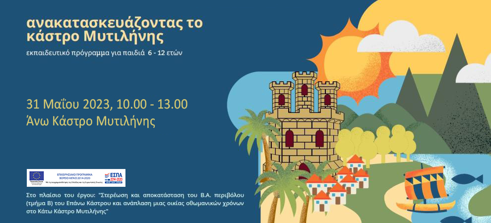 Η Εφορεία Αρχαιοτήτων Λέσβου, στο πλαίσιο της δημοσιότητας και ολοκλήρωσης του έργου «Στερέωση και αποκατάσταση Βορειοανατολικού Περιβόλου (τμήμα Β) του Επάνω Κάστρου και ανάπλαση μιας οικίας οθωμανικών χρόνων στο Κάτω Κάστρο Μυτιλήνης», διοργανώνει σε συνεργασία με την Ειδική Υπηρεσία Διαχείρισης Βορείου Αιγαίου της Περιφέρειας Βορείου Αιγαίου και το Πολύτροπον, το εκπαιδευτικό πρόγραμμα για παιδιά ηλικίας 6-12 ετών, «Ανακατασκευάζοντας το κάστρο της Μυτιλήνης», την Τετάρτη, 31 Μαΐου 2023 και ώρα 10.00 π.μ. - 13.00 μ.μ. στο Άνω Κάστρο Μυτιλήνης. Ελάτε να γνωρίσουμε το μνημείο του Κάστρου σε ένα βιωματικό πρόγραμμα με δράσεις που θα αγκαλιάσουν και θα χαρούν οι μικροί μας φίλοι. Οι εγγραφές ανά ομάδες γίνονται στα γραφεία της Εφορείας Αρχαιοτήτων Λέσβου ή στα τηλέφωνα 22510 22087 & 22510 42589 (υπόψιν κας Εύας Βλαχονικολού). Ανώτατος αριθμός συμμετεχόντων: 50 άτομα σε τρεις ομάδες