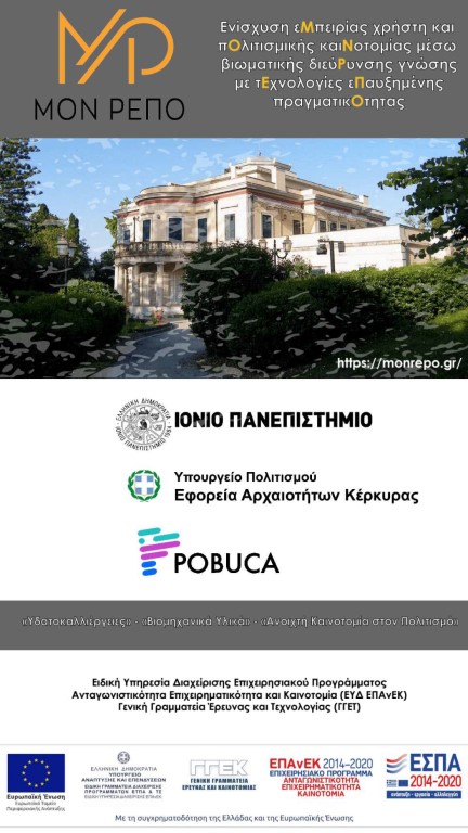 Το έργο «Ενίσχυση εΜπειρίας χρήστη και πΟλιτισμικής καιΝοτομίας μέσω βιωματικής διεύΡυνσης γνώσης με τεχνολογίες Επαυξημένης ΠραγματικΟτητας (ΜΟΝ ΡΕΠΟ)» συγχρηματοδοτείται από το ΕΠ Ανταγωνιστικότητα, Επιχειρηματικότητα και Καινοτομία (ΕΠΑΝΕΚ) 2014-2020 στο πλαίσιο της Ειδικής Δράσης «Υδατοκαλλιέργειες» - «Βιομηχανικά Υλικά» - «Ανοιχτή Καινοτομία στον Πολιτισμό», με συνολικό προϋπολογισμό 640.000 €.Αποσκοπεί στην ανάπτυξη εφαρμογής για smartphone ή tablet, η οποία μέσω της τεχνολογίας της Επαυξημένης Πραγματικότητας θα δίνει τη δυνατότητα στους επισκέπτες του αρχαιολογικού χώρου του Κτήματος Mon Repos και του Μουσείου Παλαιόπολης να εντάσσονται στο χώρο και να προσεγγίζουν θέματα μελέτης, συντήρησης και ερμηνείας των σωζόμενων μνημείων. Απώτερος στόχος του έργου είναι η επίσκεψη στο Mon Repos να μετατραπεί σε μία ολοκληρωμένη εμπειρία προσαρμοσμένη στα ενδιαφέροντα, την ηλικία και το υπόβαθρο κάθε επισκέπτη. Εντάσσοντας με τον τρόπο αυτό το Mon Repos στην παγκόσμια ομάδα μνημείων που χαρακτηρίζονται από σύγχρονη προσέγγιση και υψηλά επίπεδα προσαρμογής στις νέες απαιτήσεις και τεχνολογικές δυνατότητες, τα οφέλη που θα απορρεύσουν θα είναι πολλαπλά, καθώς αναμένεται να συμβάλουν στη διεθνή προβολή του χώρου, στην αύξηση της επισκεψιμότητάς του, αλλά και στην εξυπηρέτηση των διαφοροποιημένων αναγκών και απαιτήσεων του κοινού.Το έργο υλοποιείται από το Ιόνιο Πανεπιστήμιο, την Εφορεία Αρχαιοτήτων Κέρκυρας και την εταιρεία POBUCA.Διάρκεια έργου: 26.05.2020 - 25.11.2023Προϋπολογισμός έργου: 640.000,00 € (για την ΕΦΑ Κέρκυρας: 160.000,00 €) Ιστοσελίδα έργου: https://monrepo.gr/