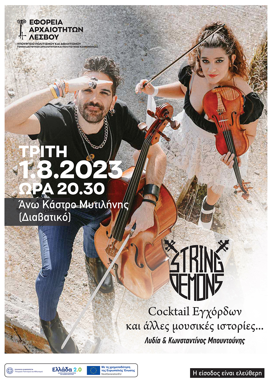 Η Εφορεία Αρχαιοτήτων Λέσβου σας προσκαλεί στη μουσική παράσταση «Cocktail Εγχόρδων και άλλες μουσικές ιστορίες...», που θα πραγματοποιήσει το σχήμα εγχόρδων String Demons, των αδερφών Λυδίας και Κωνσταντίνου Μπουντούνη, στο Άνω Κάστρο Μυτιλήνης (Διαβατικό), την Τρίτη 1 Αυγούστου 2023 και ώρα 20:30.